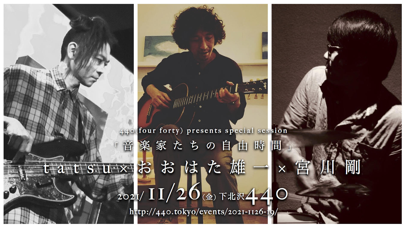 おおはた雄一 × tatsu(LÄ-PPISCH) × 宮川剛のライブが11月26日(金)に下北沢440で開催される。限定枚数の来場チケットのほか、イープラス「Streaming+」での生配信も予定している。
