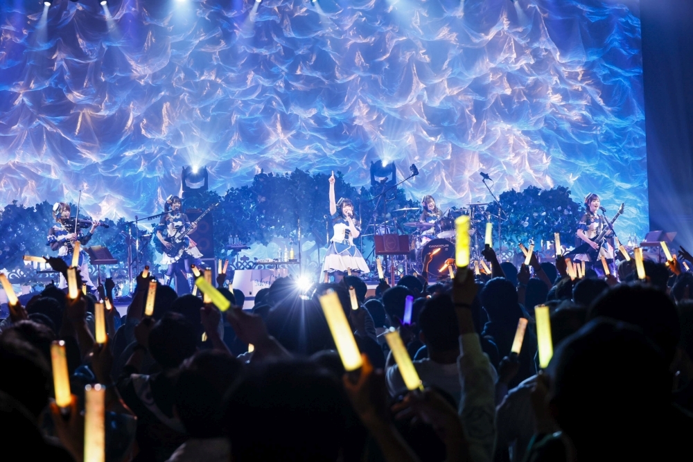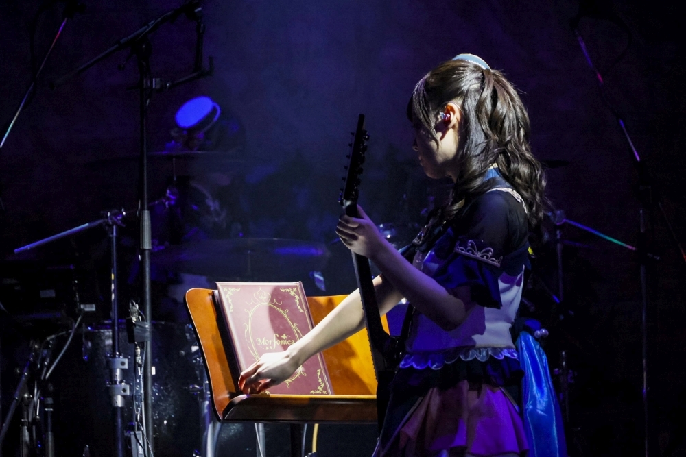 会場の照明が落とされると、舞台上の楽譜台にスポットライトが落とされた。そこにはMorfonicaのロゴが印字された一冊の本が置かれている。まるでおとぎ話の始まりのようなBGMが流れ始めると、メンバーの5人がステージへ登場し、ギターの桐ヶ谷透子役の直田姫奈が表紙をめくり、その物語を読み聞かせる。