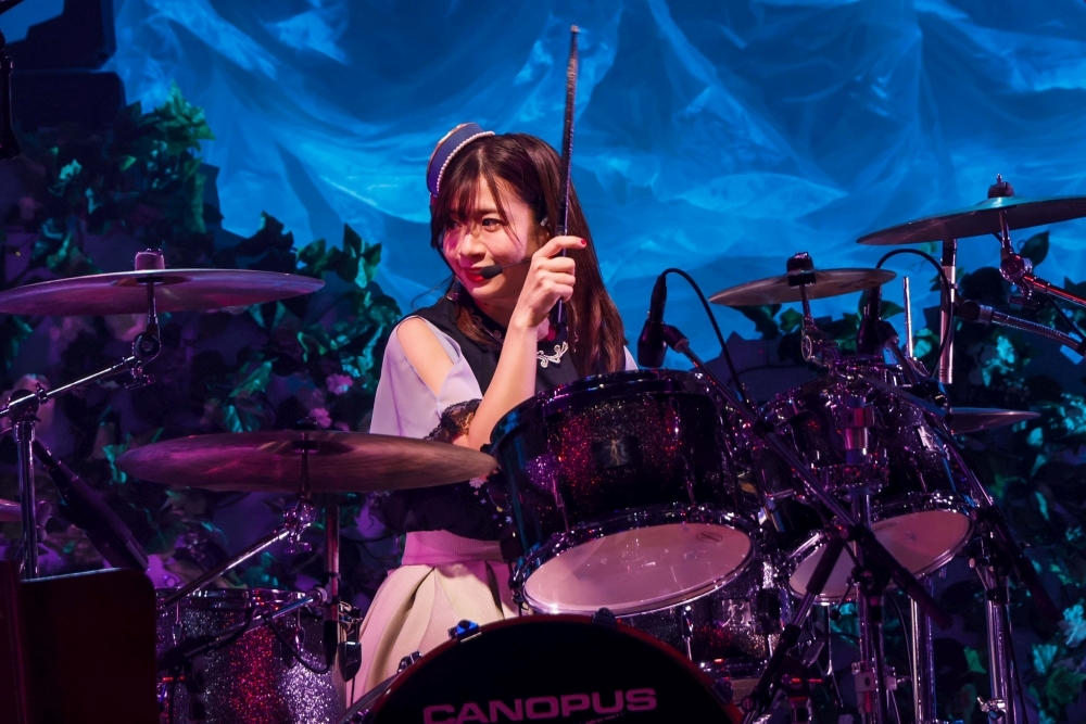 7曲目は「V.I.P」。「あこがれを今、掴んだ」という歌い出しは、まるでそんな生まれ変わった世界の訪れを知らせる希望の歌のようだ。「月光花」、「深海少女」と、ここはカヴァー楽曲の流れが続く。エモーショナルなバイオリンの旋律の月光花に酔いしれ、泡の弾ける音から入った深海少女ではピチカートも用いられ、またドラムスのmikaやベースの西尾夕香らリズム隊も静かに激しく、その感情を音にぶつけていた。