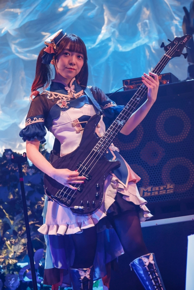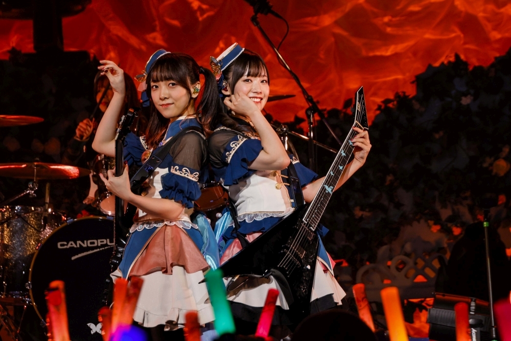10曲目は「Nevereverland」。バイオリンのAyasa、そしてボーカルの進藤あまねとポツリ、ポツリとスポットライトで1人ずつ照らされていく。静と動、イントロから一気に激しいサウンドになると、たまらずメンバーもヘドバンし、まさに乱れ咲きだ。それに応えるようにフロアも大いに湧き上がり、ペンライトが激しく振りかざされる様子や、会場の照明も激しく点滅し、終盤戦に向けて、会場のボルテージも上がっていく。