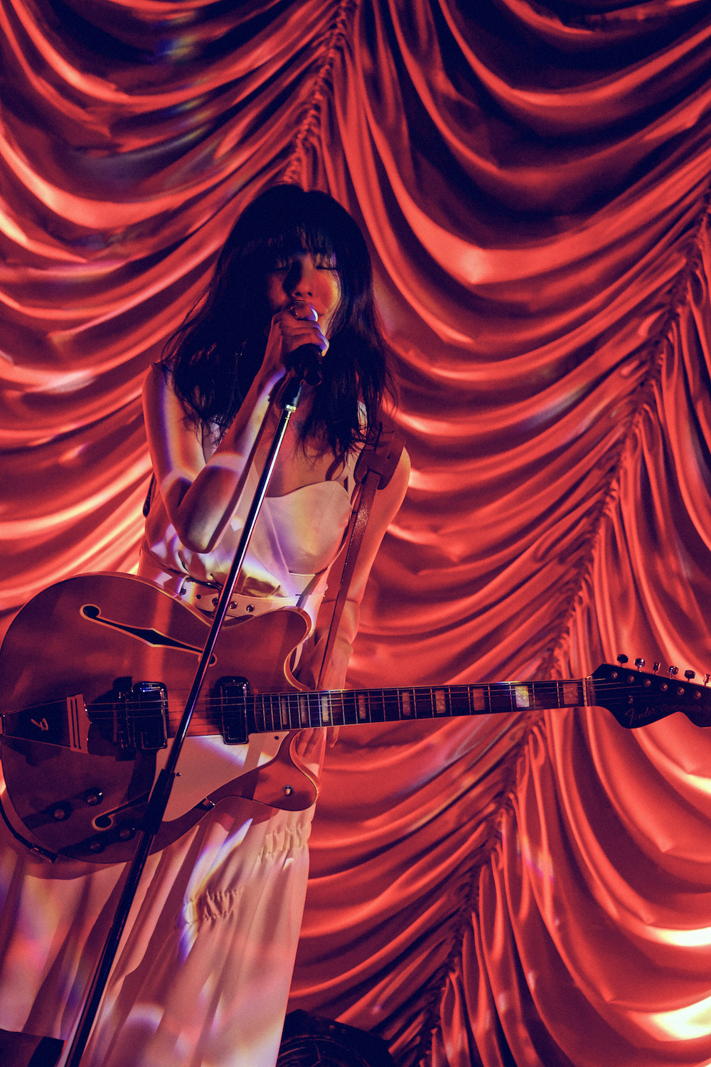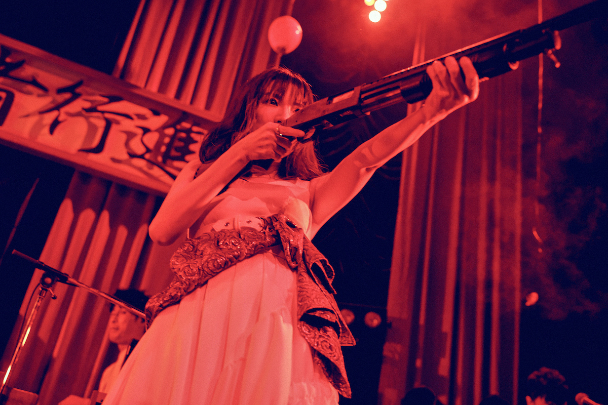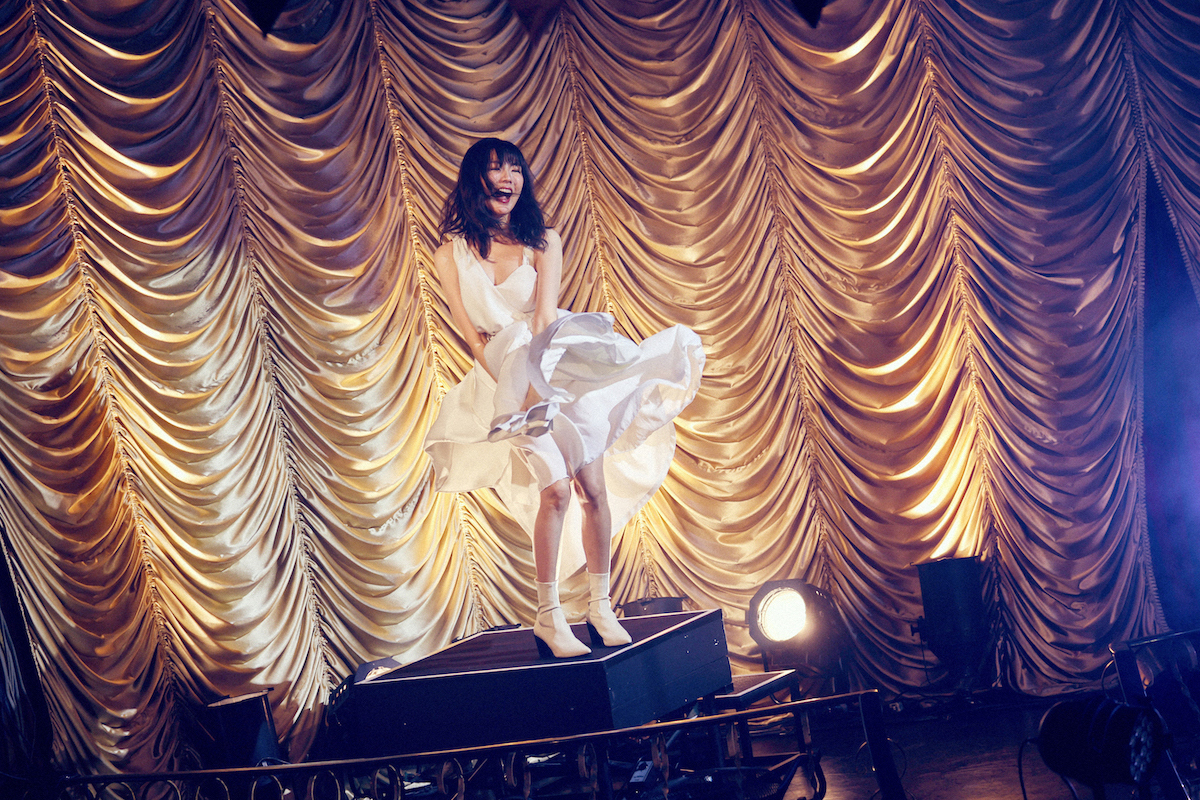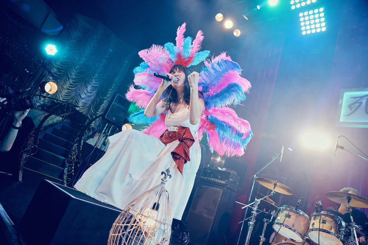 他にも、怪しげなギターリフがキネマ倶楽部という会場にも映えた「竹」など、次々に曲を届けていたのだが、なかでも秀逸だったのが、「合わせ鏡」からの「モンロー」だった。「合わせ鏡」は、これまで9年間活動してきた中で、ファン同士で結婚したというカップルも少なくないことから、それを受けて黒木が初めて書いたウェディングソングだ。そんな曲をリリースした後、これは「私とファンの歌」でもあることに気付いたと話す。真っ白なライトを浴びながら、白いワンピースを着て柔らかな歌声を届けると、続く「モンロー」では、曲タイトルにもなっている名女優をオマージュした演出でも客席を盛り上げていて、会場全体が幸せな空気で充満しているのが画面からでも伝わってきた……のだが、ここからライブは予想だにしない方向に進んでいく。何が起きたのかは、ぜひともアーカイブ映像をご覧いただきたい。