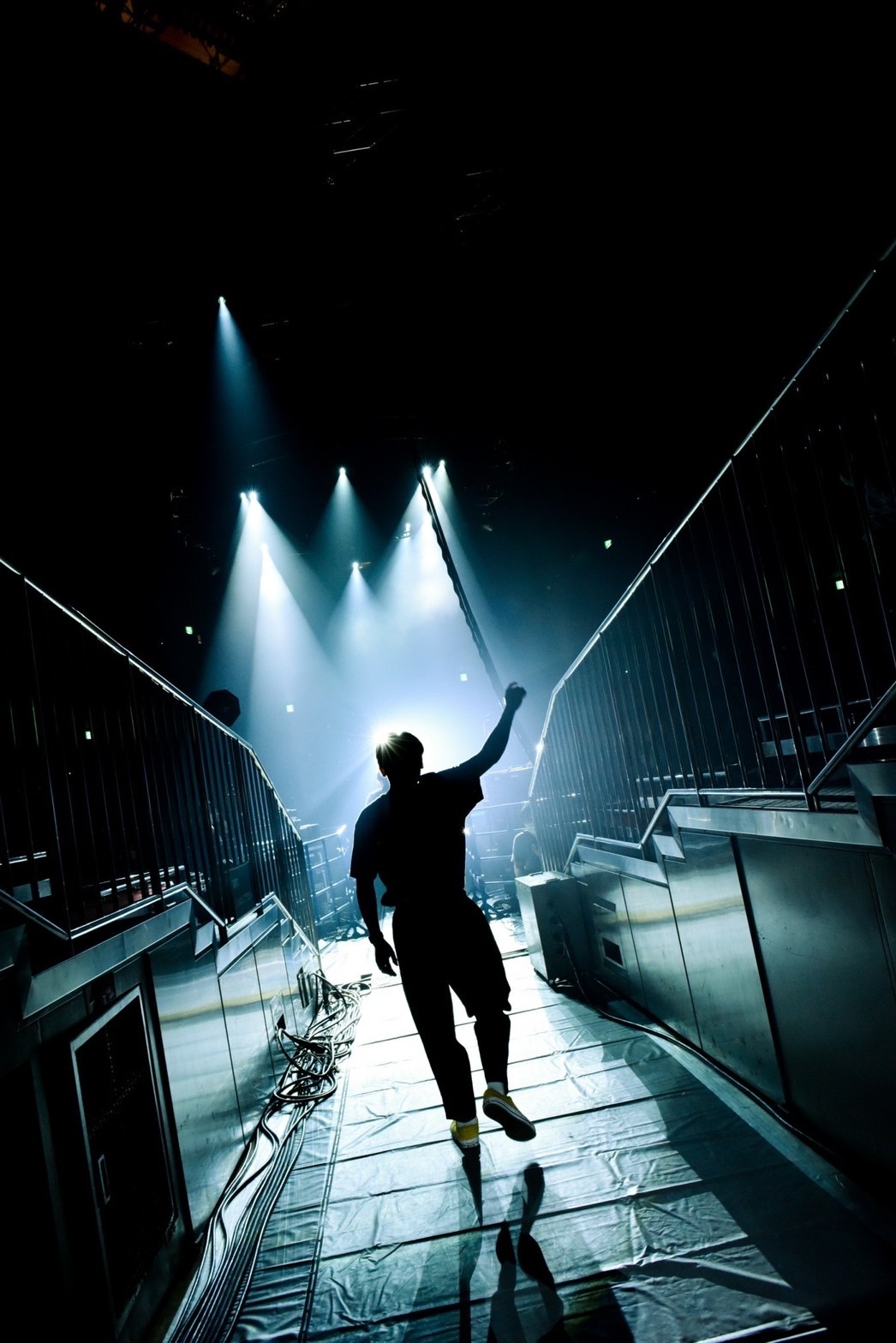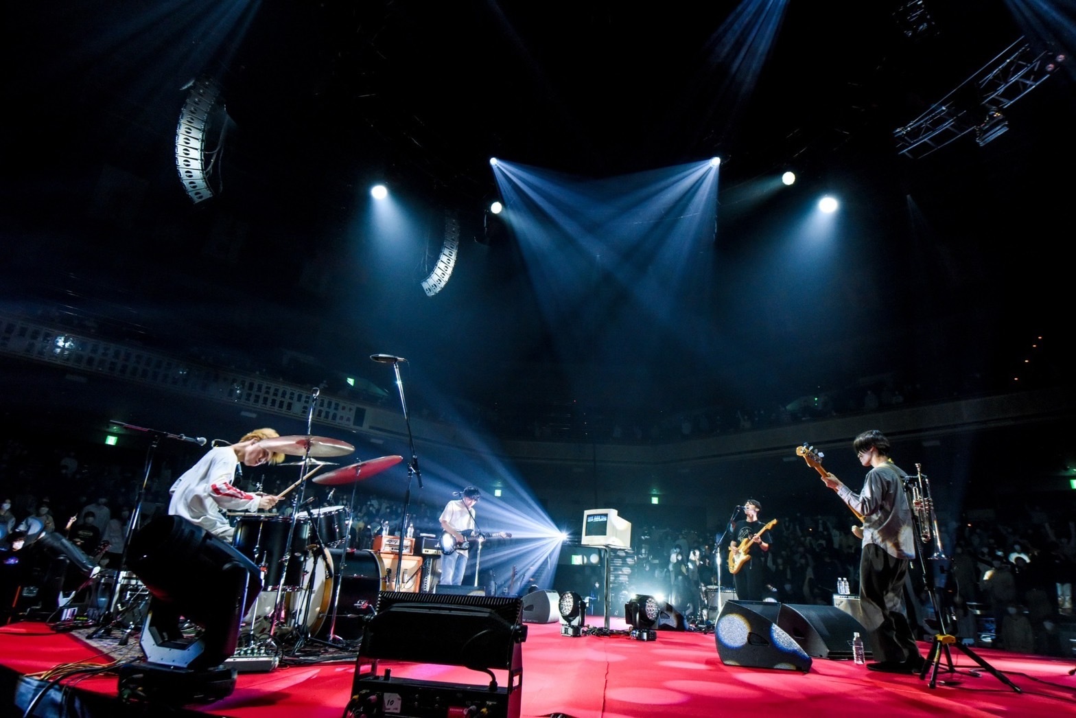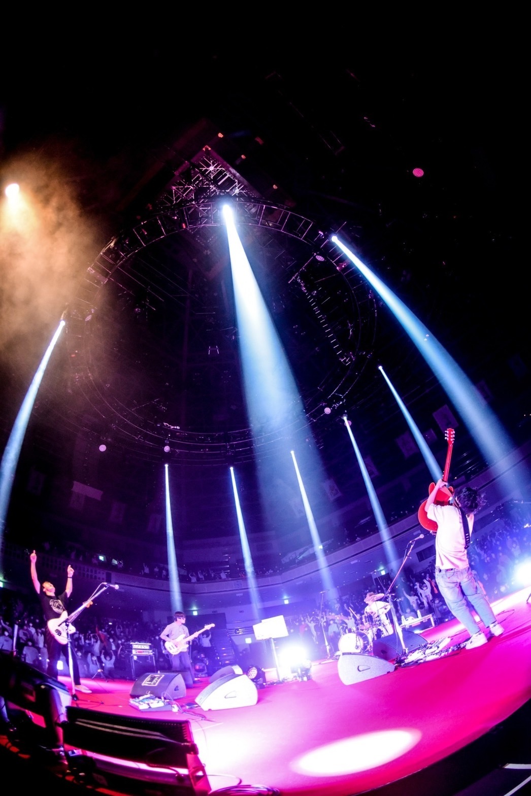 普段は国技である大相撲の興行で使われているこの会場。土俵の置かれる会場中央に真紅のセンターステージが設置され、“砂かぶり席”と呼ばれるステージ極近の席、升席、スタンド席が360度で囲む配置は、ライブハウスともホール会場とも明らかに趣きが異なり、この日が特別なライブであることを開演前から感じさせてくれる。開演時間を少し過ぎた頃、会場の灯りが落ち、SEが鳴るとステージを囲むライトが天を射し、神々しさや神妙ささえある中をメンバー4人が登場。