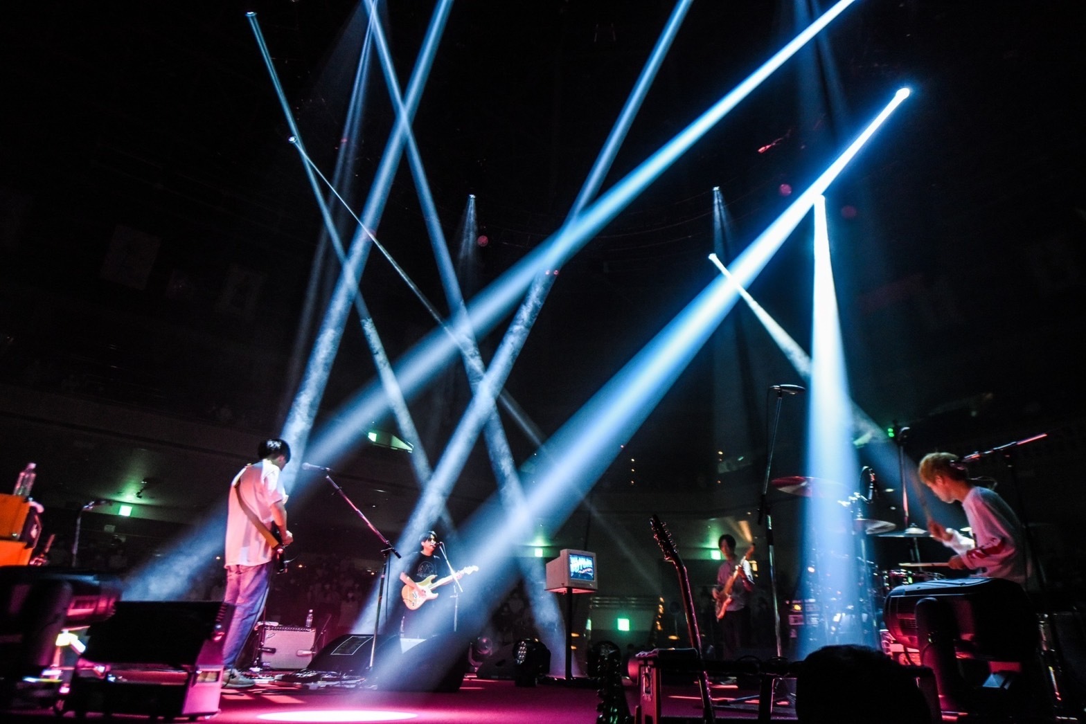 ステージ中央に設置されたPCのモニタを囲み、4人が中心を向いて円形に配置すると、細川千弘(Dr)の鳴らすバスドラの深い響きに横山が歌声を重ね、「We Are The Future」でライブの幕が開ける。上坂仁志(Gt)、佐藤知己(Ba)がサウンドを重ね、楽曲世界を丁寧に描いていくと、<響け この声よどこまでも>と歌う開放感ある力強いサビに会場中が拳を挙げる。<音楽で大切なものを守れますように>と願いを込めたこの曲には、この時期にこの大会場でのライブを開催した意義も感じさせられる。