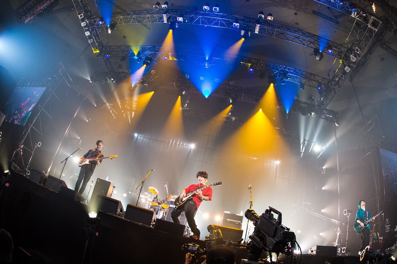 そういう「ザ・武道館」仕様の提示をしながら、同時に、とにかくバカスカ飛び跳ねるライブバンドのままであるところが最高だった。幕開けこそ威風堂々でも、4曲目「Free Throw」あたりで空気は変わる。細美と戸高はこれ以上近づけないほど接近して対面し、スコットはぐるぐると楽しそうに回転。そして曲の終わりには3人が自然にドラムセットへと向かう。観客に背を向け、天井の日の丸などもそっちのけで「一瀬、お前のキメで最後にジャンプするぞ」と待ち構えているわけだ。まったく、この広いステージでどんだけ密にくっついてるのか。距離の近さが可笑しくて仕方がない。