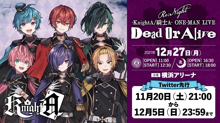 また、12月27日(月)横浜アリーナにて行われる3rdワンマンライブ「Re:Night – KnightA/騎士A – ONE-MAN LIVE『Dead Or Alive』」のTwitter先行チケット受付が、本日11月20日(土)21時よりスタートした。Twitter先行受付期間は12月5日(日)23時59分まで。