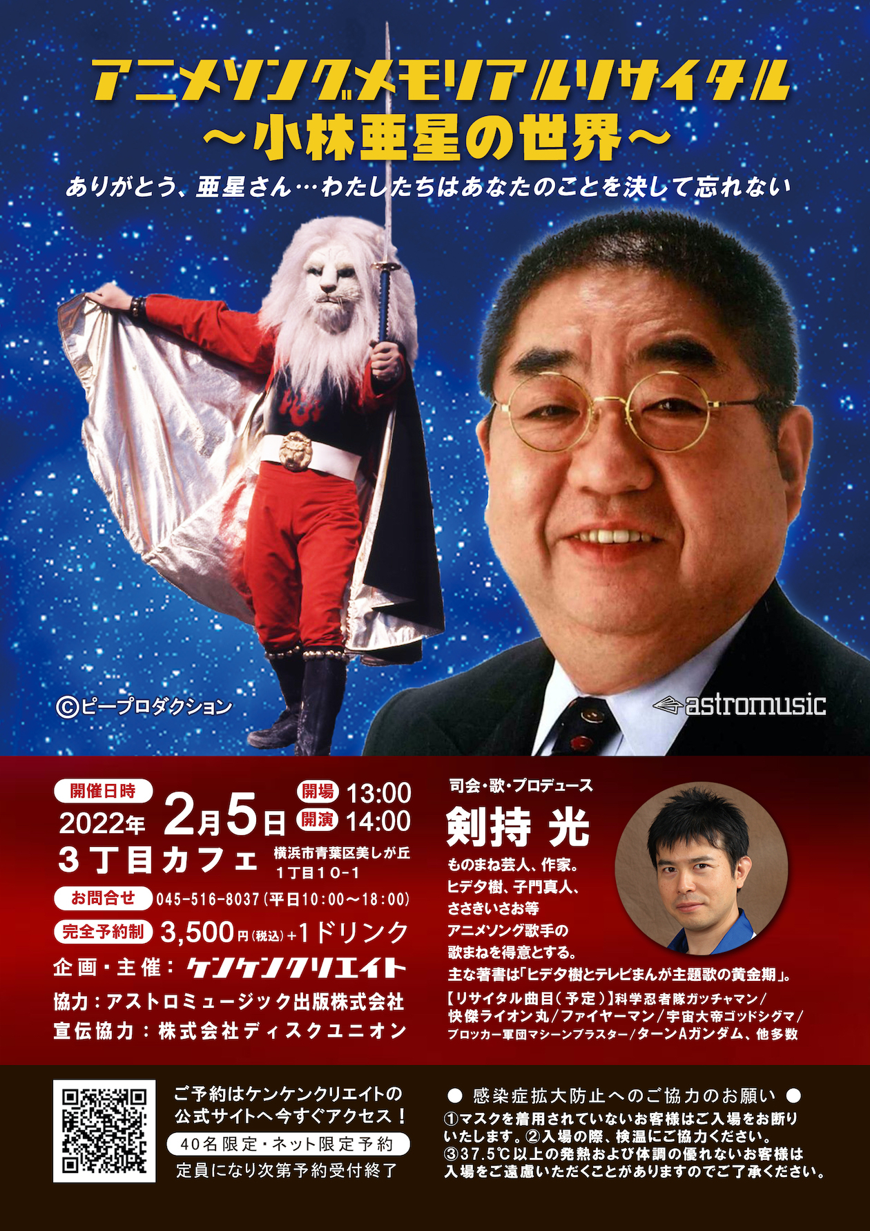 2021年5月に逝去した作曲家・小林亜星。彼がこれまで手掛けてきた数々のアニメスングにスポットライトをあてたライブ『アニメソングメモリアルリサイタル~小林亜星の世界』が2022年2月5日に横浜たまプラーザ「3丁目カフェ」にて開催されることとなった。