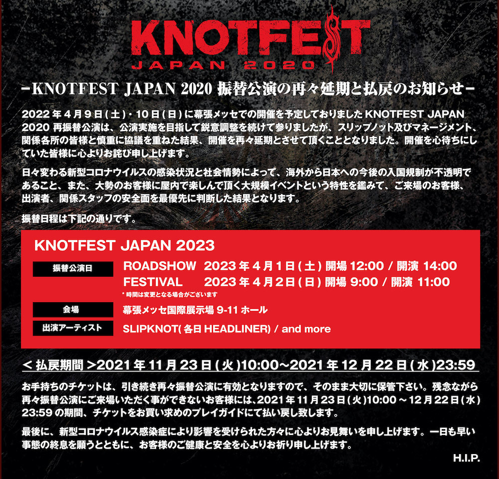 COVID restrictions are still not allowing us to perform. Unfortunately we must postpone KNOTFEST Japan, but we look forward to coming back and performing for you on April 1-2, 2023. Until then,our full set from KNOTFEST Los Angeles will be streamed exclusively in Japan on November 27th,so don’t miss it. Keep each other safe, and we’ll see you very soon.
