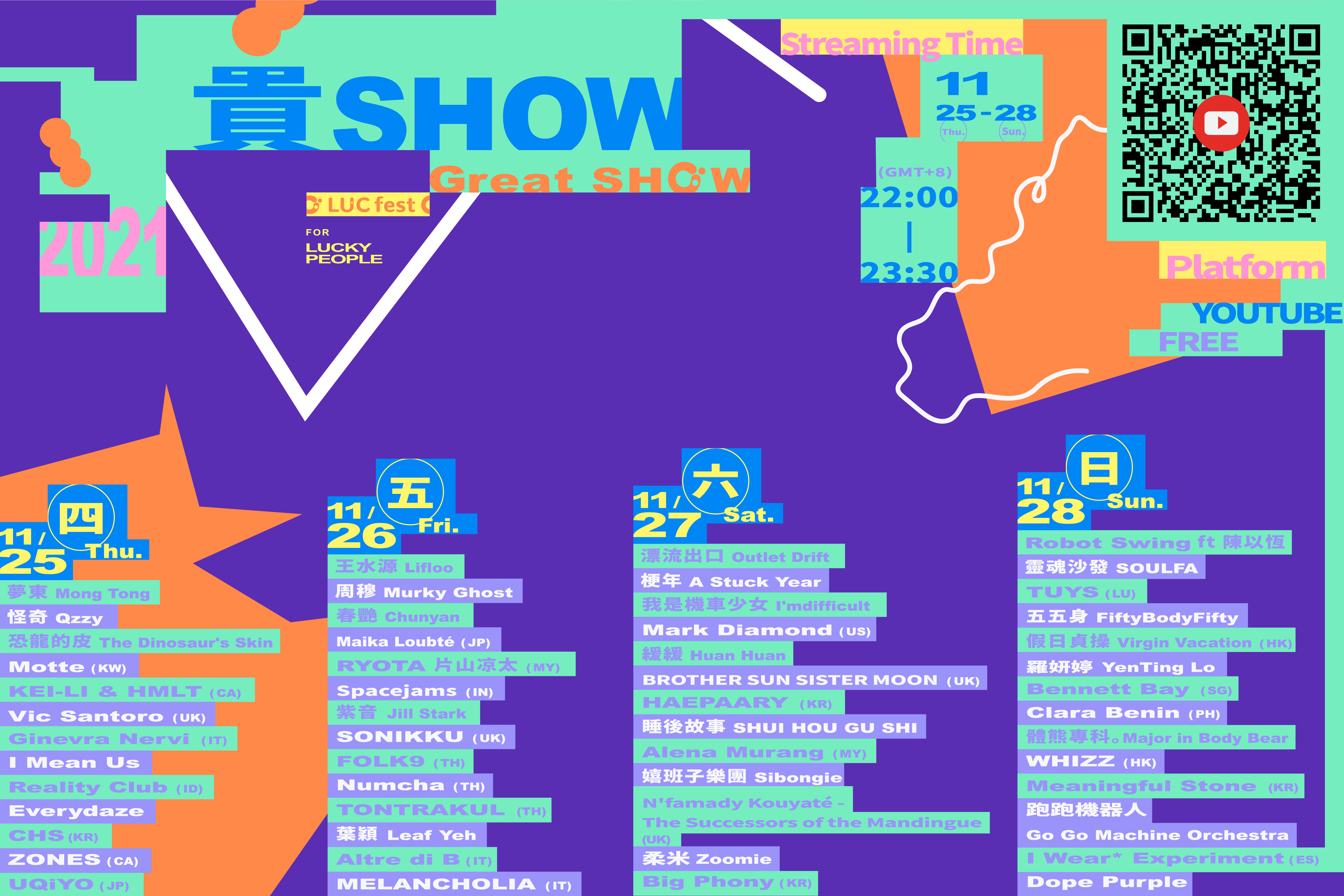アジアと世界の音楽シーンを繋げることを目的とした音楽フェスティバル『LUCfest(貴人散步音樂節)』が11月25日~28日の4日間、台湾・台南市において開催される。 5回目を迎える今年は新型コロナウイルス影響もあり、台湾国内のアーティストが台南市内の会場にてショーケースが行われる以外に、世界中のアーティストによるオンラインショーケースプログラム「GREAT SHOW」も11月25日~28日まで開催される。