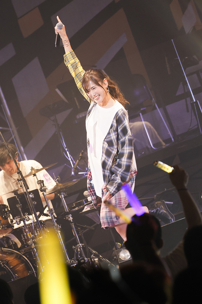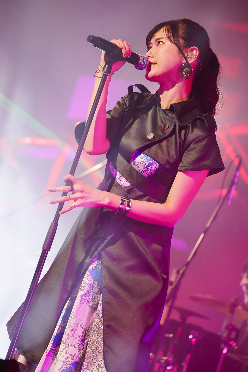 さらに鳴り響くシンセサイザーの音色から「Dear answer」が始まる。「みんな盛り上がって行こうぜ!」という掛け声とともに、これまでスタンドマイクを前に直立していた彼女がマイクを片手に舞台上を移動し始める先ほどまで力強く歌い上げていた彼女が距離を詰め、歌を投げかけくる。このたった三曲のパフォーマンスで彼女は会場中を自分の世界の内側に誘い入れてしまったのだ。