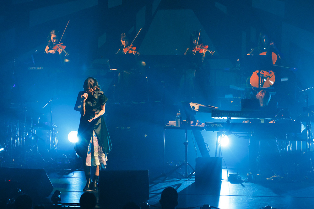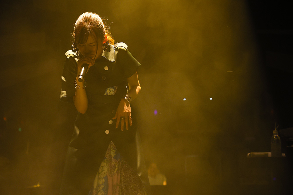 三曲を終え、改めて「みんな会いたかったです!元気にしてた!?」と挨拶。声を発することができない客席からは、それに必死に動きで応える。ここから彼女が立て続けに披露したのは『コトバアソビ』に収録されている「inorganic」と「空に読む物語」。共に別れをテーマとし、観客を前に初めて歌唱されるこの2曲。しっとりとした楽曲でありながらも、彼女の歌声の力強さは依然、明確に感じとれた。そして歌う彼女の潤んだ瞳は聴くものの涙を誘う。