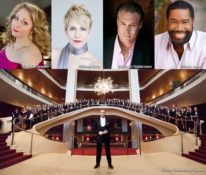 (上段左から)クリスティーン・ガーキー(ソプラノ)、ジョイス・ディドナート(メゾソプラノ)、ブランドン・ジョヴァノヴィッチ(テノール)、エリック・オーウェンズ(バス・バリトン)(下段)MET オーケストラと音楽監督ヤニック・ネゼ=セガン