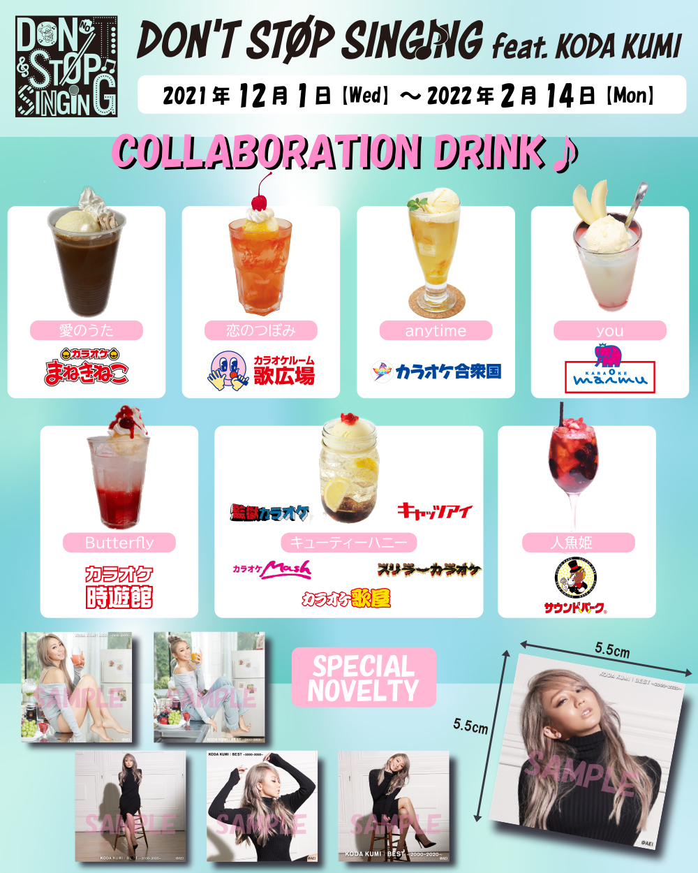 今回のコラボキャンペーンでしか手に入らない特製オリジナルグッズの限定予約販売が決定した。予約受付期間は2021年12月1日~12月15日までの2週間限定。また、12月6日にリリースされる倖田來未キャリア初となるオールタイムベストアルバム『BEST~2000-2020~』に合わせ、各参加カラオケ企業が倖田來未の名曲をそれぞれイメージしたオリジナルコラボドリンクを1種企画。1杯注文で特製ステッカー(全6種)が1枚ランダムでプレゼントされる。その他にも様々な企画が用意されているとのことなのでキャンペーン詳細サイトをチェックしよう。