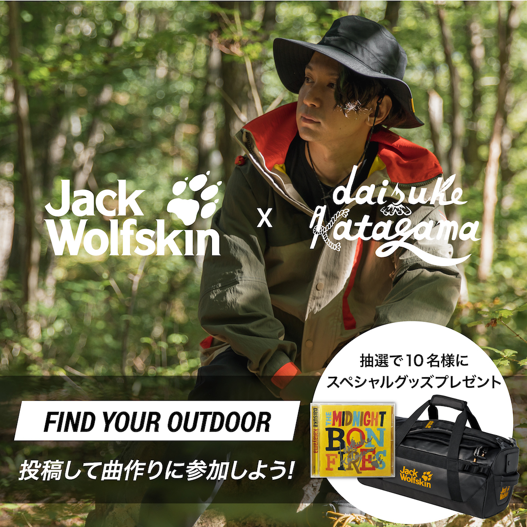 「FIND YOUR OUTDOOR~投稿して曲作りに参加しよう!~」と題し、自然の中で過ごす時間をより豊かに、楽しいものに演出するための楽曲を参加者と一緒に作っていく企画が本日11月30日よりスタート。Jack Wolfskin公式インスタグラム上で 「自然の中で発見したこと」をテーマに、その中で生まれた自分達の生き方や価値観、人との繋がりを感じた言葉やエピソードを募集し、応募された言葉やエピソードを参考にしてdaisuke katayamaが曲作りを行うという。