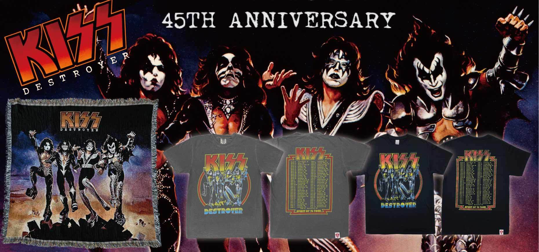 「DESTROYER 地獄の軍団Tシャツ」は、アルバムのアートワークと1976年のワールド・ツアーの公演日程をプリント。ブラックとヴィンテージグレーの2カラー展開となっている。「DESTROYER 燃えたぎるブランケット」は、アルバムのアートワークを全面にデザインした数量限定のオフィシャル輸入ブランケット。丈夫なコットン素材で、重量感があり長く使用することができるという。約W135 × H120cmと大きめなサイズ感で、ラグマットなどのインテリアとしても活用可能。