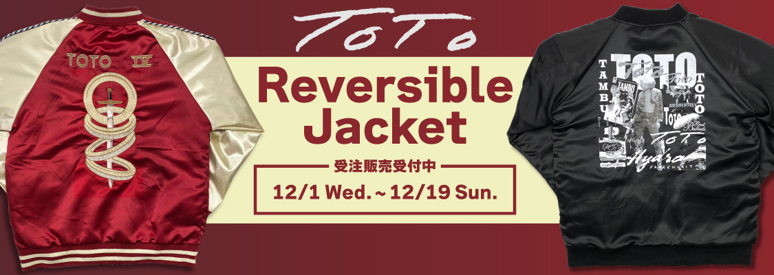 さらに、ウドーWEBショップ人気アイテム「リバーシブルジャケット」にTOTOが登場。名盤『TOTO IV』アルバム・アートワークを全面刺繍した表面と、歴代のアルバム・ジャケットやロゴをコラージュしたMA-1風の裏面。1着で2通りのデザインを楽しむことができる。本日から12月19日(日)23:59までの受注販売となるとのこと。(※TOTO「リバーシブルジャケット」は送料無料キャンペーン対象外)