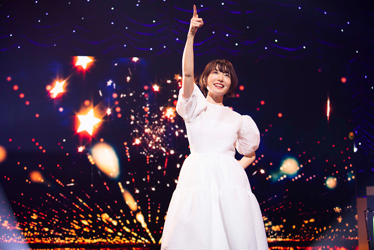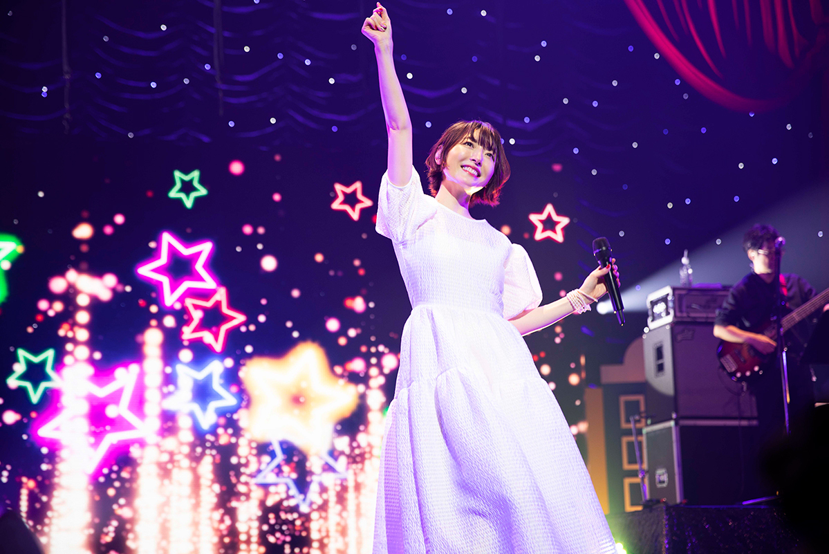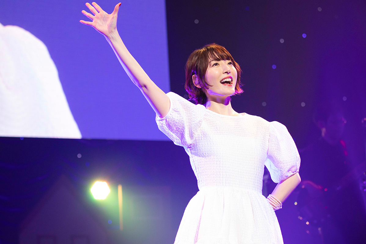 オープニングは本年9月にリリースされた移籍第1弾シングル「Moonlight Magic」と、そのカップリング曲「港の見える丘」からスタート。座席の間隔を空けながらもいっぱいのファンが駆けつけた会場が、大きな拍手で花澤さんを出迎える。花澤自身、有観客でのライブ開催が2020年2月以来とあって、ファンの前で歌えることへの喜びが表情からも歌声からもあふれだすようだった。また、この公演は日本国内と中国の2か国で生配信が行われているということで、2曲を歌い終えたところで日本語と中国の両方で挨拶。グローバルに活躍する花澤らしい一幕となった。
