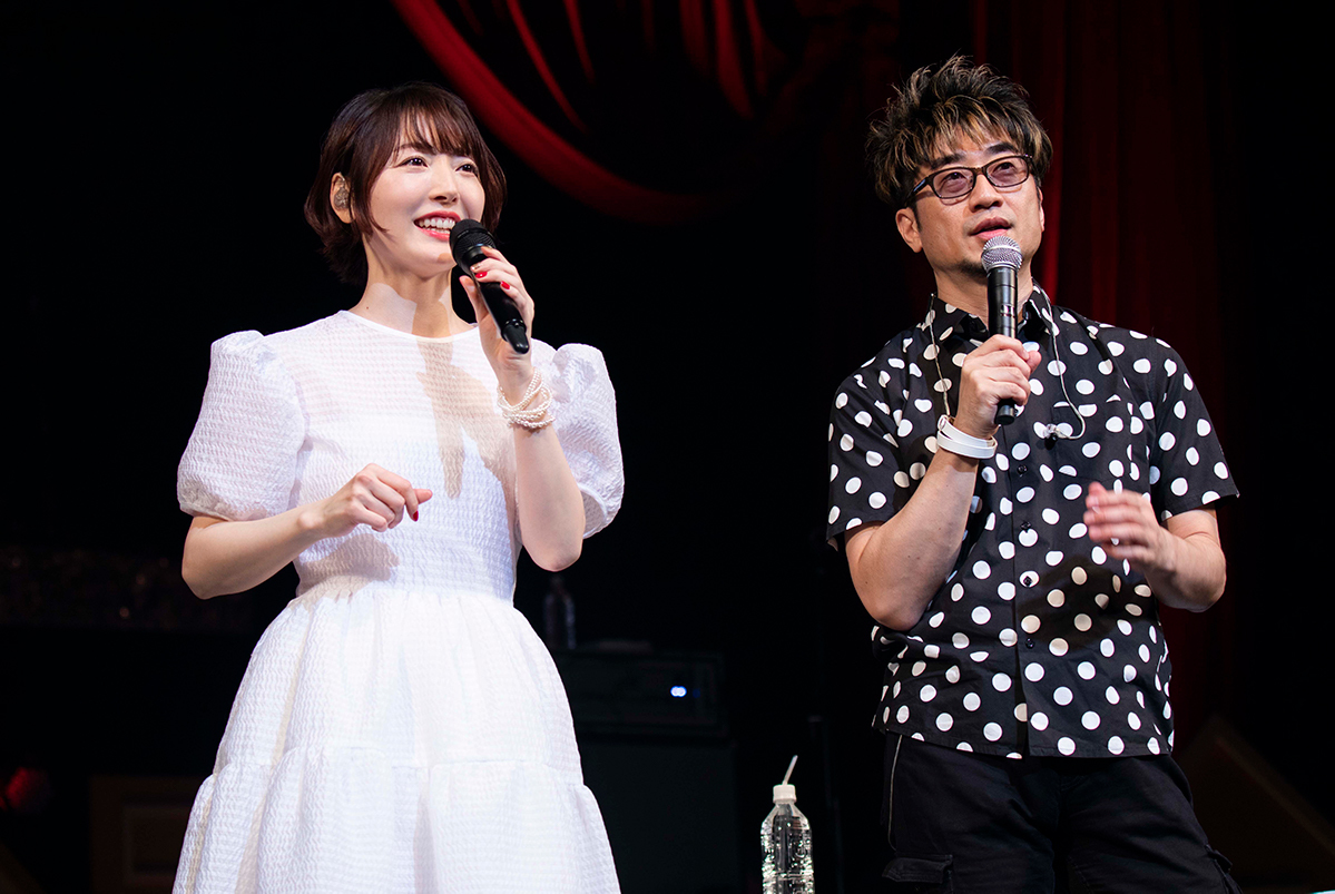 この日のライブはトークコーナーを挿みながら進行し、前半パートでは中国語通訳のビンビンを交えて北川勝利と共に楽曲の裏話について語った。「Moonlight Magic」「港の見える丘」はいずれも作詞が花澤、作曲が北川のコンビによる作品だが、楽曲が出来上がるまでの話を生でじっくり聴けるというのはなかなか貴重で、濃いひと時だったといえるだろう。そして、開演からまだ間もないこの時間帯でいきなりの重大発表が。