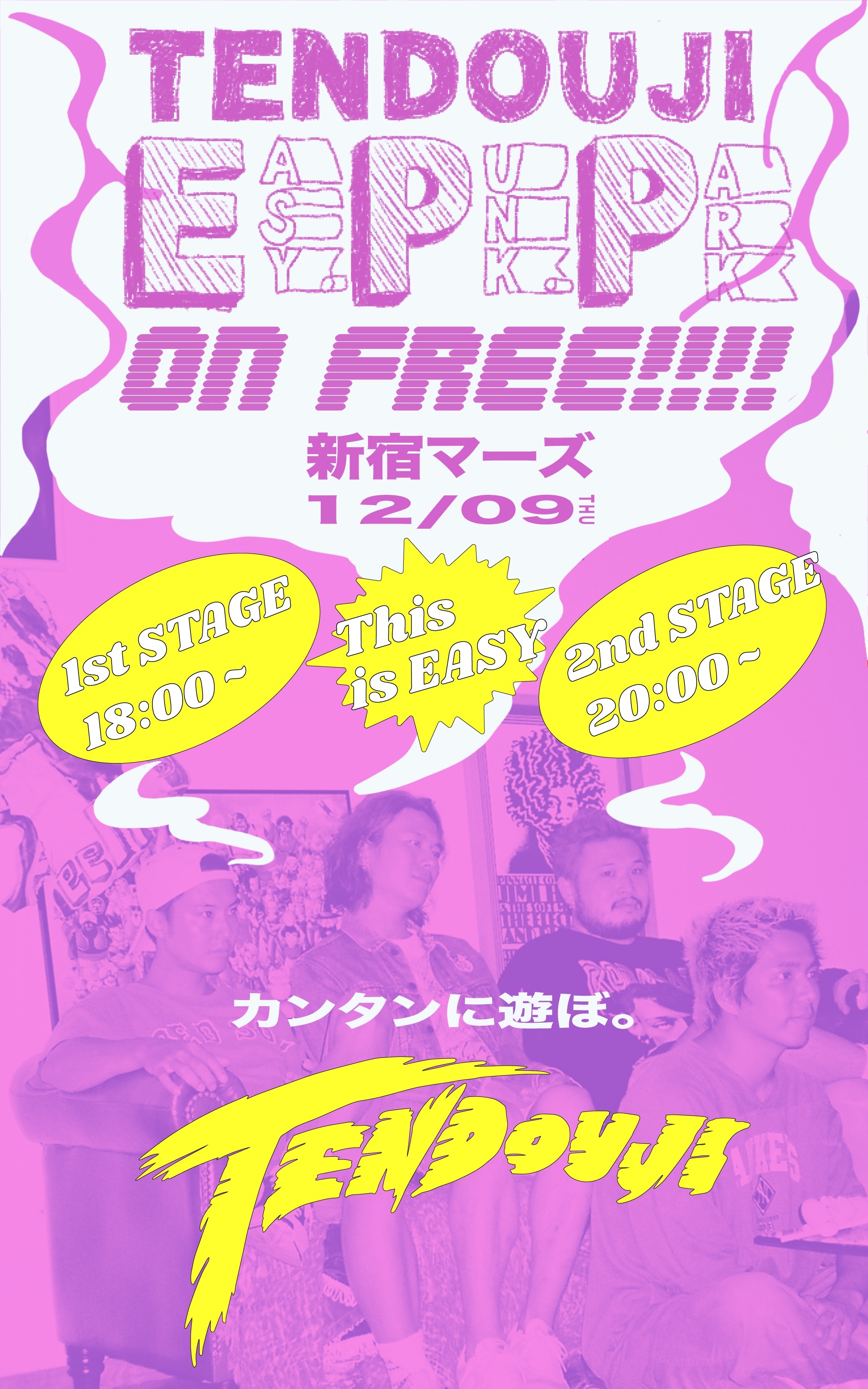 『EASY PUNK PARK on free!!』と題して行われるこのフリーイベントは、自由に簡単に遊びに来てほしいというTENDOUJIの想いと、新宿MARZの20周年を記念して行われる。
