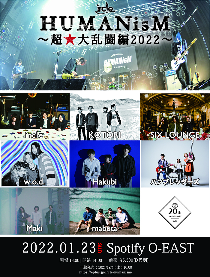 結成20周年を迎えた大分県別府市出身4人組ロックバンド「ircle」が掲げるイベント『HUMANisM』(読み方:ヒューマニズム)。来年1月に、Spotify O-EASTで開催される『HUMANisM〜超★大乱闘編2022〜』にSIX LOUNGEとハンブレッダーズが追加発表された。