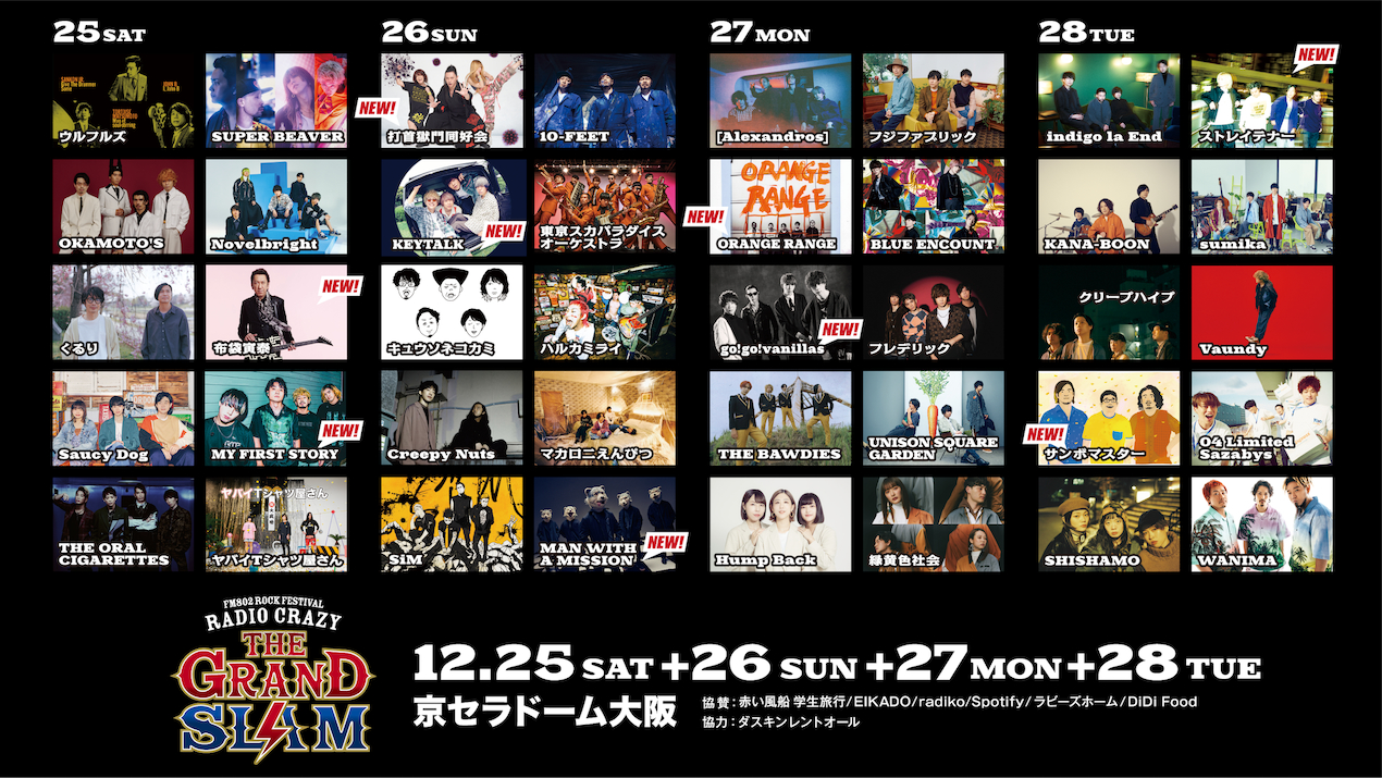 12月25日(土)、26日(日)、27日(月)、28日(火)の4日間、京セラドーム大阪にて開催する『FM802 ROCK FESTIVAL RADIO CRAZY presents THE GRAND SLAM』にサンボマスターの出演が発表、同時に全日程のタイムテーブルが公開された。