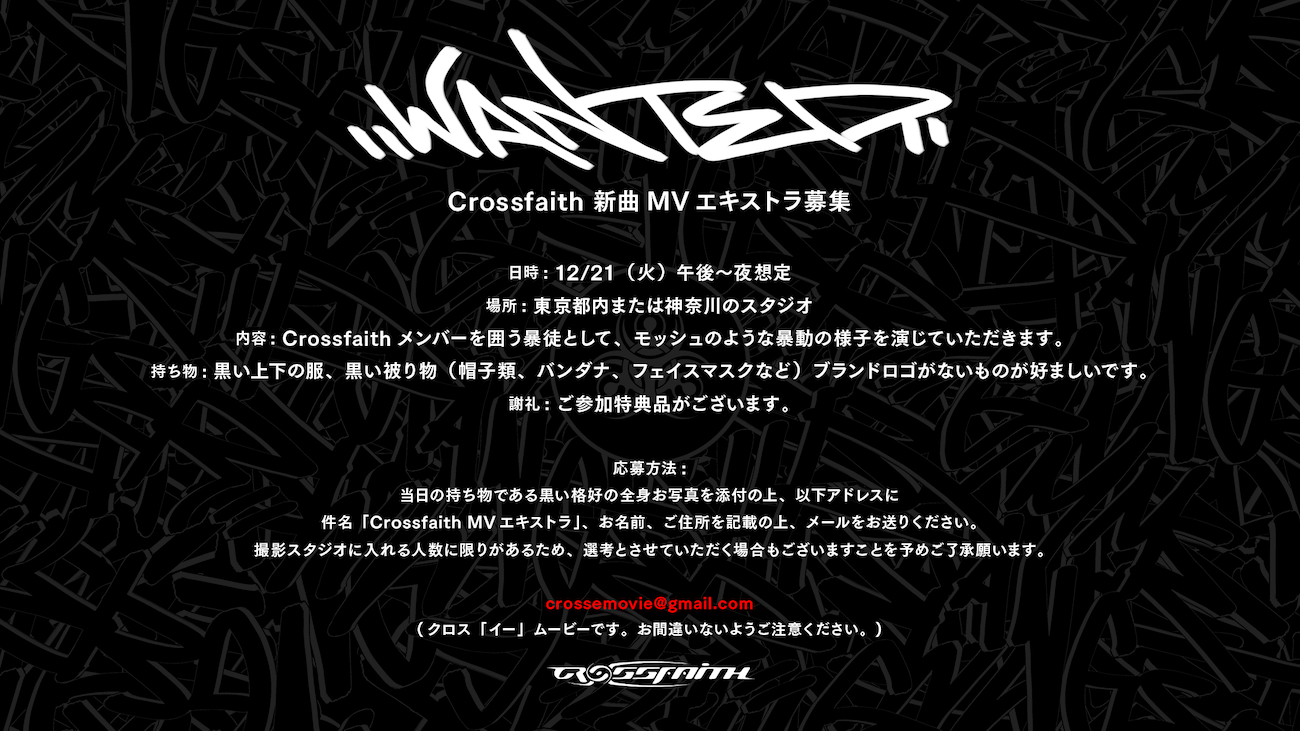 Crossfaithが、来年にリリースするシングルのMUSIC VIDEOにて初のエキストラを募集することを発表した。