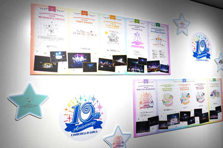 会場入口付近の「Ⅰ.等身大アイドルお出迎えゲート」を過ぎたら、「Ⅱ.10年の軌跡年表ゾーン」でライブの歴史を参照しよう。『アイドルマスター シンデレラガールズ』が初めてライブを開催したのは、2014年の『THE IDOLM@STER CINDERELLA GIRLS 1stLIVE WONDERFUL M@GIC!!』。今までにナンバリングライブ(タイトルに数字が入るライブ)は7回行っている。