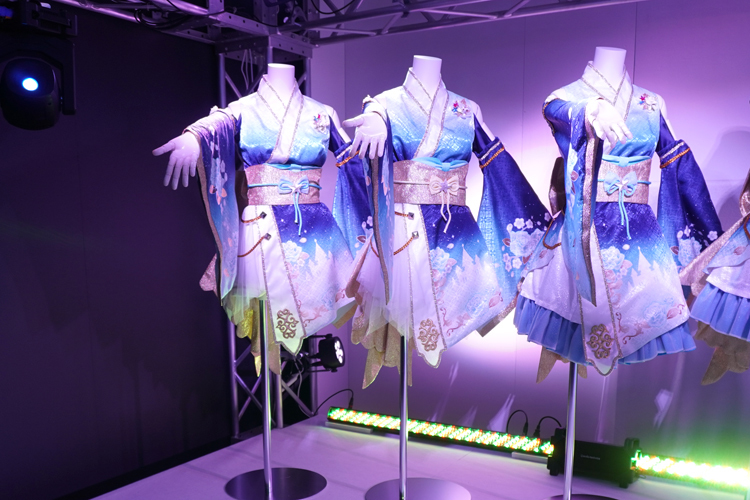 「Ⅴ.ライブ体験衣装展示ゾーン」の展示の一部。帯締めにアイドルの属性が反映されている。