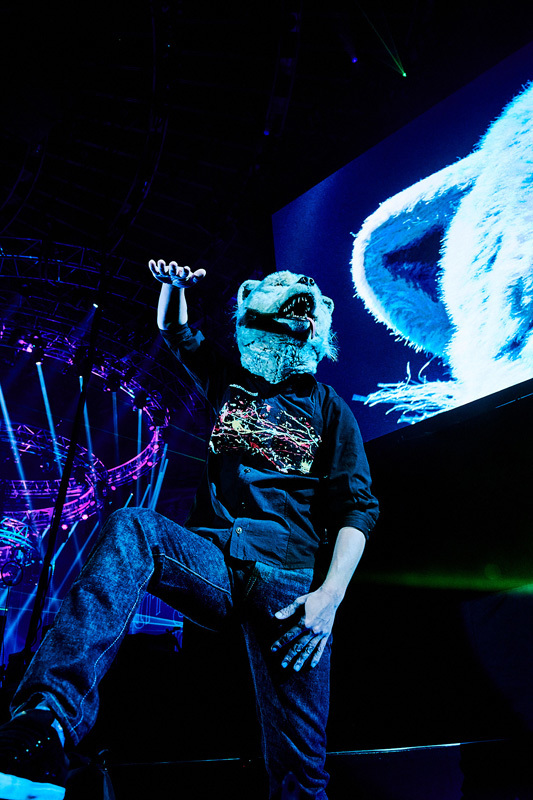 ファイナルでは、Suspended 4thがオープニングを飾り、オンボーカルの楽曲からインストゥルメンタルのセッションまで多才なプレイで場内を魅了。十分にあたたまった場内にMAN WITH A MISSIONの登場SEのBad Religion「MAN WITH A MISSION」が鳴り響くと、オオカミたちの登場を今か今かと待ちわびた観客たちの前にステージ下方から結成10周年に企画され、惜しくも新型コロナウィルスの影響で開催が叶わなかった野外イベント『THE MISSION』の舞台セットの一部だった巨大オオカミの風船がつるし上げられた。ステージを覆わんばかりのその姿に割れんばかりの拍手が巻き起こり、はじまったのは「Change the World」、「evils fall」。Jean-Ken Johnnyが「言イタイコトハワカリマスネ?思ウ存分ニ楽シンデ、ソシテナニヨリモ、カカッテキナサイ!!」と叫ぶと拍手で堂々応戦する観客たち。続く、「evergreen」ではレーザーや炎の特攻がド派手に上がると、場内が一斉に飛び上がり、さらに会場が熱気で包まれた。観客に「心ノ中デ歌ッテクダサイ」とJean-Ken Johnnyの一言を挟み「Raise your flag」「database」と攻め上げていく。さらに、ミュージックビデオから飛び出てきたようなムービングライトで円を描くライティングが印象だったこのツアーのタイトル曲「Merry-Go-Round」。「Memories」では観客席から徐々に携帯電話によるライトが灯り、煌めく空間が生み出され、イントロから拍手が湧きたった「higher」で前半のハイライトを迎えた。