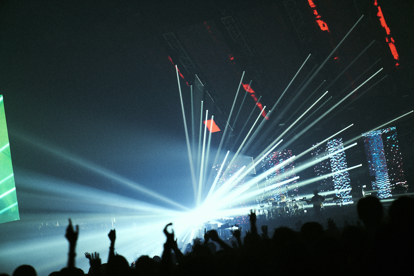 オープニングは、モノクロの映像とノイズが混じり合いヘヴィなビートに乗せてスタジアム・ロックなサウンドを轟かせる「飛行艇」からスタート。今年2021年に開催された『東京2020オリンピック』でも様々なシーンで耳にした魂に火を灯すナンバーだ。常田大希(Gt.Vo.)は、まずあいさつがわりに「東京!」とシャウトした。勢いそのままに、井口理(Vo.Key.)&常田によるツインボーカルがインパクト絶大なアッパーチューン「千両役者」へと突入。ここでも常田は「King Gnuはじめっぞ!」と熱い叫びを響かせる。緑のレーザーが縦横無尽に飛び交うなか、唯一無二の4人によるダイナミックなプレイで一気に会場の空気をヒートアップさせていく。