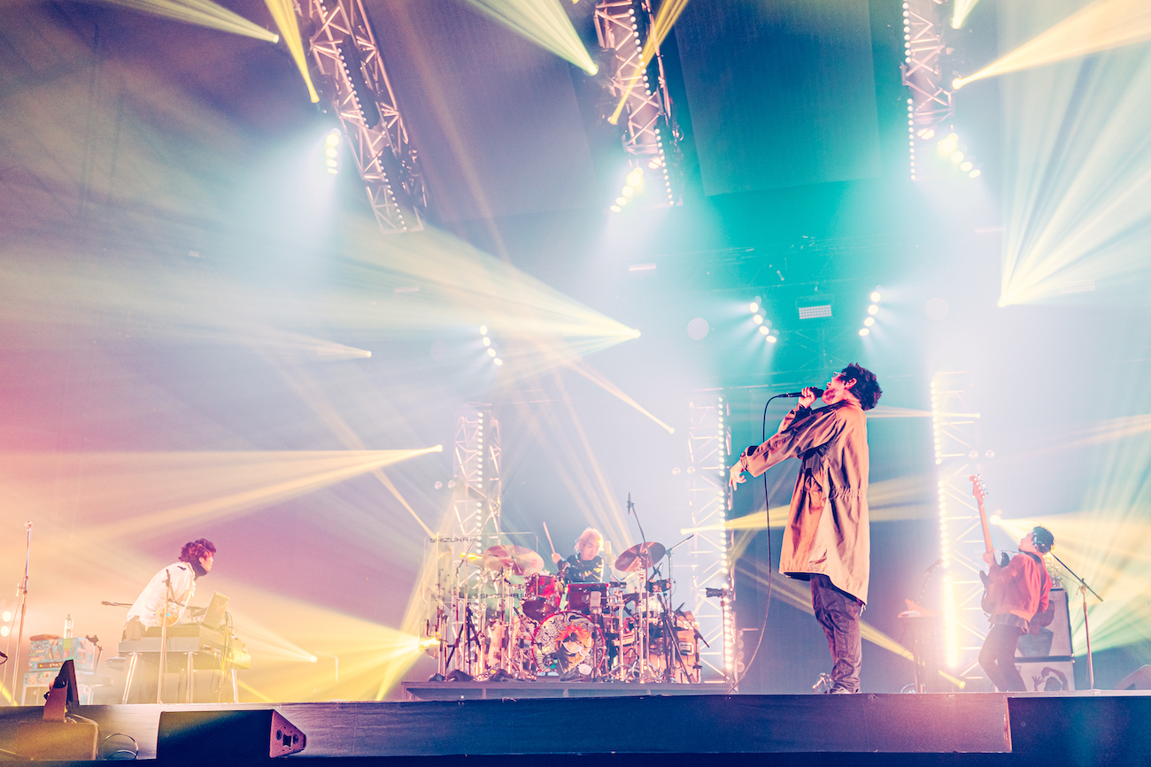 オーラスへ向けて爽快な「傘」、ロック濃度高めの「どろん」によってグルーヴィーに脳内のアドレナリンがかき混ぜられつつ。とどめはアグレッシヴなビートチューン「Flash!!!」における、煌めくライティング&バンド・アンサンブルによるダイナミズムだ。そして、井口による「なんか踊るとかじゃなくって、狂ってください!」と、バンド史上最も青春ロック度の高い、ストレートなナンバー「Teenager Forever」を痛快に繰り広げていく。注目は、“きらめきを探してよ”のフレーズで、井口と常田がひとつのマイクスタンドを挟んで二人で向き合いシャウトするシーンに胸ときめいたオーディエンスは多かったのではないだろうか。忘れられないワンシーンだ。
