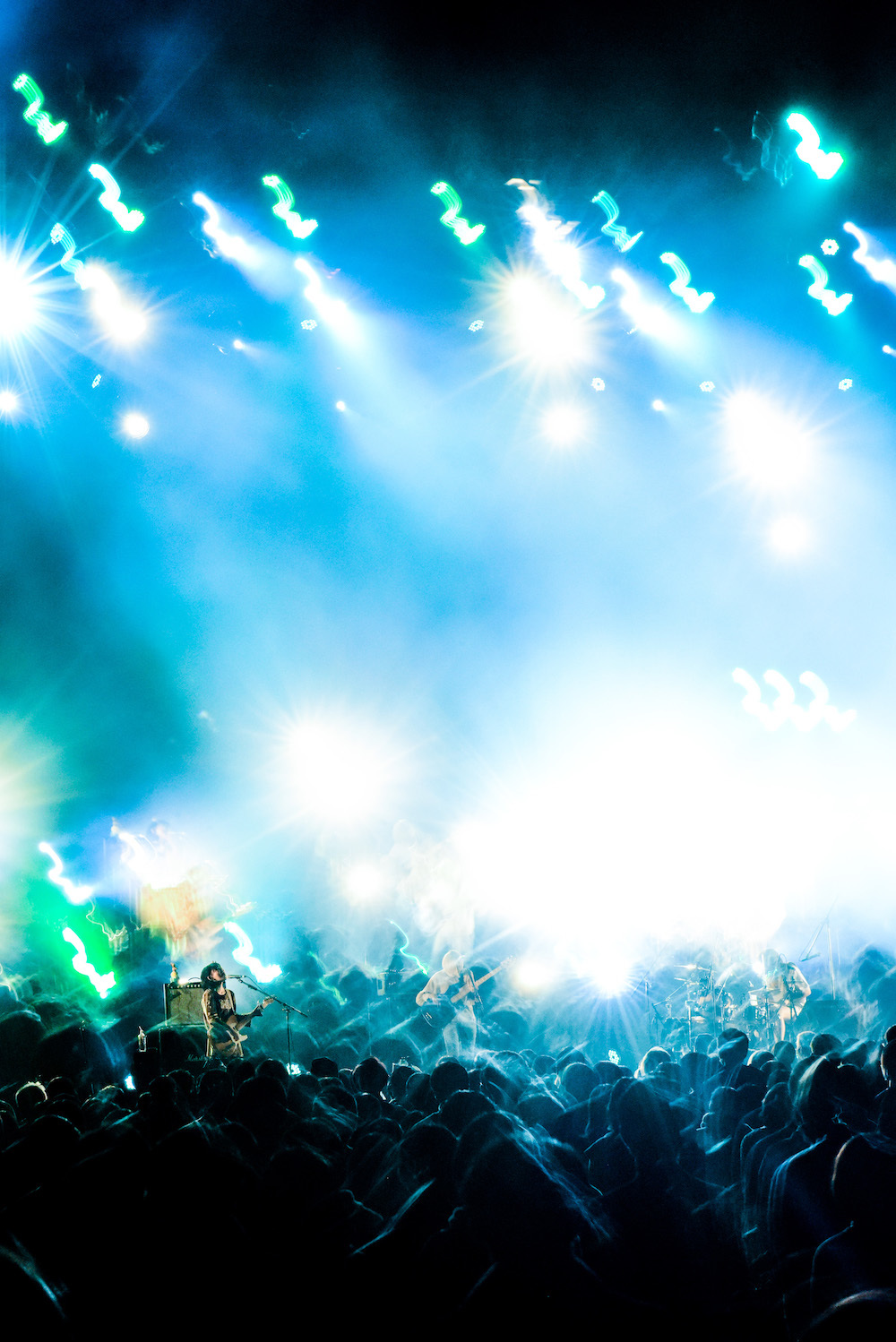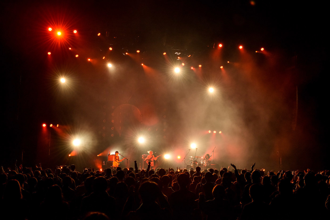 崎山がリスペクトを示していたことで、会場全体がより良いムードで転換の時間を待つ。時計のカウント音のSEとともに登場したPeople In The Boxの3人はさりげなく分厚いアンサンブルを鳴らし、そこに明瞭な波多野裕文(Vo/Gt)の声が響く。楽器の分離が良く、PAのバランスの良さを体感しながら1曲目に「かみさま」という、不条理や運命の中をそれでも進まなければいけない人生を思わせるレパートリーを持ってきたことに唸らされた。客席では何人かが彼らの登場とともに立ち上がったのだが、それも自発的でこのイベントらしく感じたことの一つだ。福井健太(Ba)のベースラインが五臓六腑に響く「ミネルヴァ」でBPMを上げ、ギター、ベース、ドラムがバトルするようなイントロ、波多野のトーキングボーカルも不穏な「無限会社」がヘヴィににじり寄る。