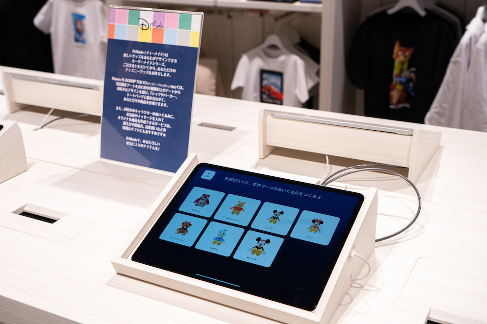 今回の目玉の一つとなるのが、地下1階にある「D-Made」のラボ。これまでディズニー公式オンラインストア『ショップディズニー』上でしか購入できなかったオーダーメイドのアイテムをここで製作することができるのだ。タッチパネルを操作しアイテムやデザインを選んでいくという簡単な手順なので、ぜひお気に入りの一品を仕上げてほしい。