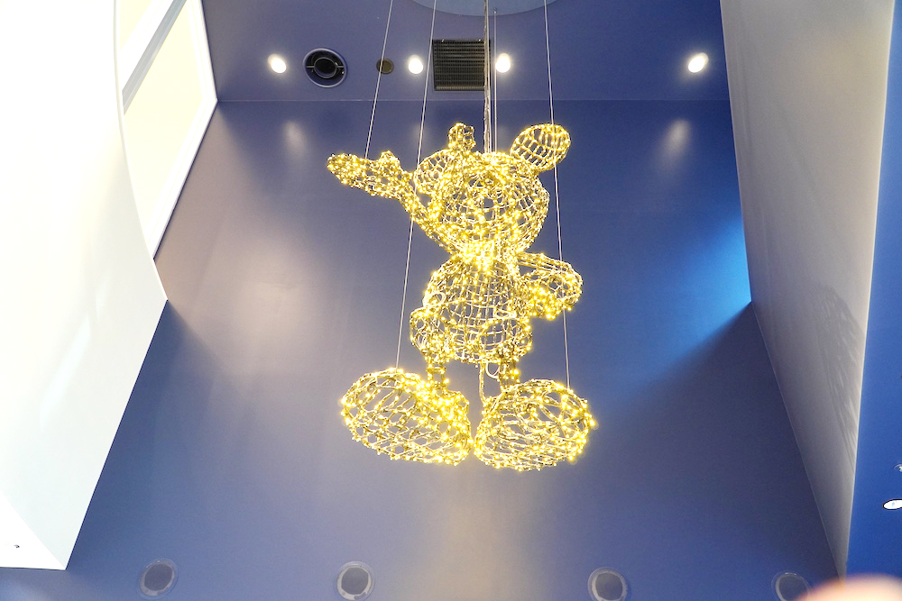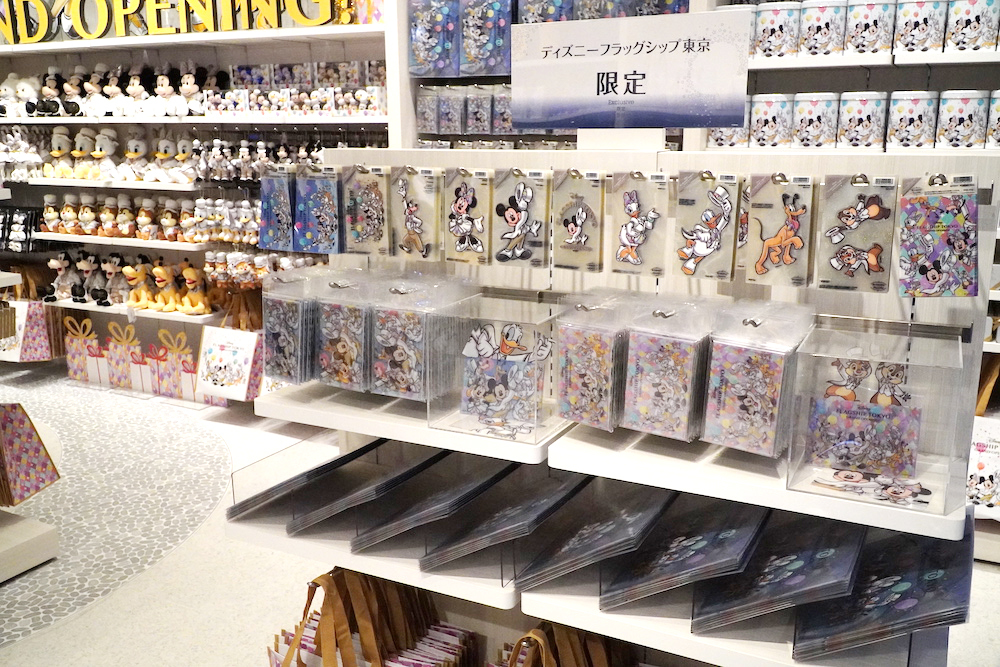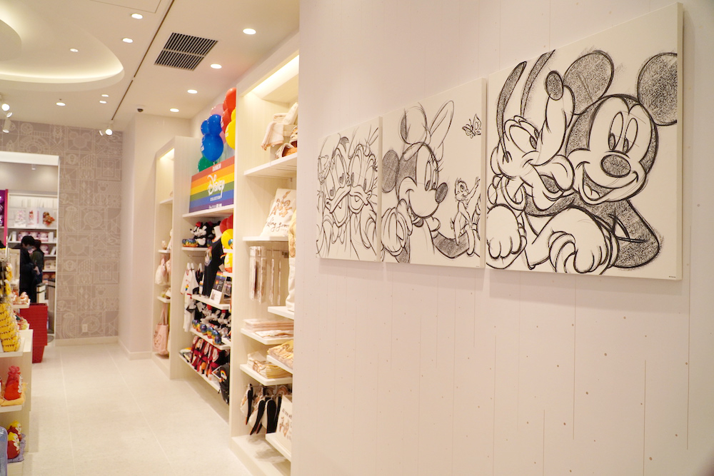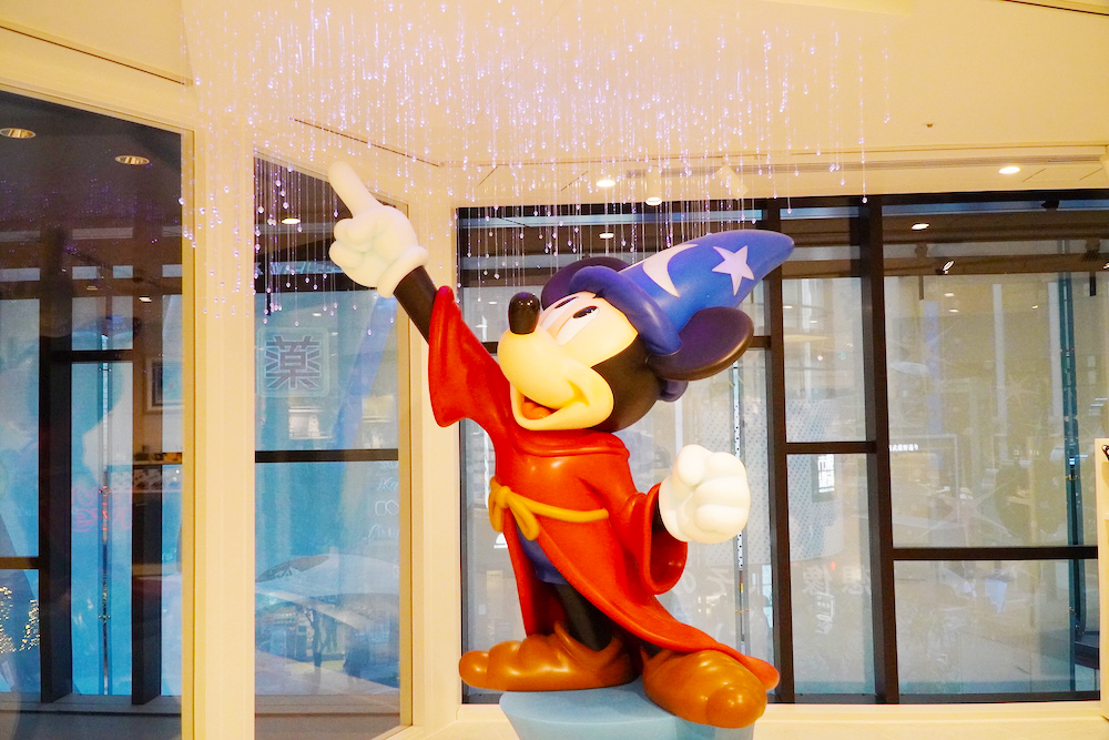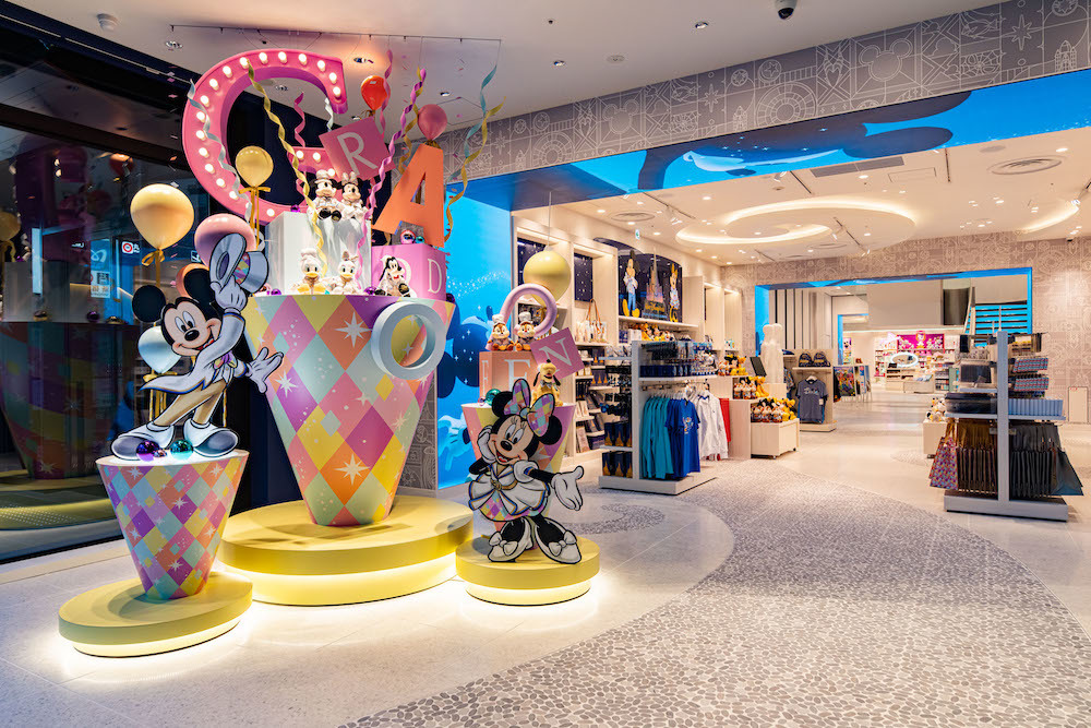 『ディズニーフラッグシップ東京』はJR新宿駅から徒歩3分、東京メトロ新宿三丁目駅のB6出口に直結しており、アクセスの良い立地にある。新宿大通りに面した1階のエントランスを入ると、グランドオープンを記念したディスプレイが目に入ってきた。ここで「うわ〜!」と早速気持ちがたかぶるのだが、ワクワクするのはここだけではない。その(店舗入り口)頭上にはLEDミッキーが輝いていたり、店内を進むと他にもスタチューが設置されていたりなど、さまざまな形でミッキーと仲間たちが出迎えてくれる。