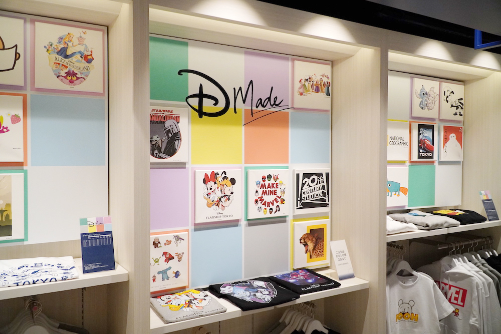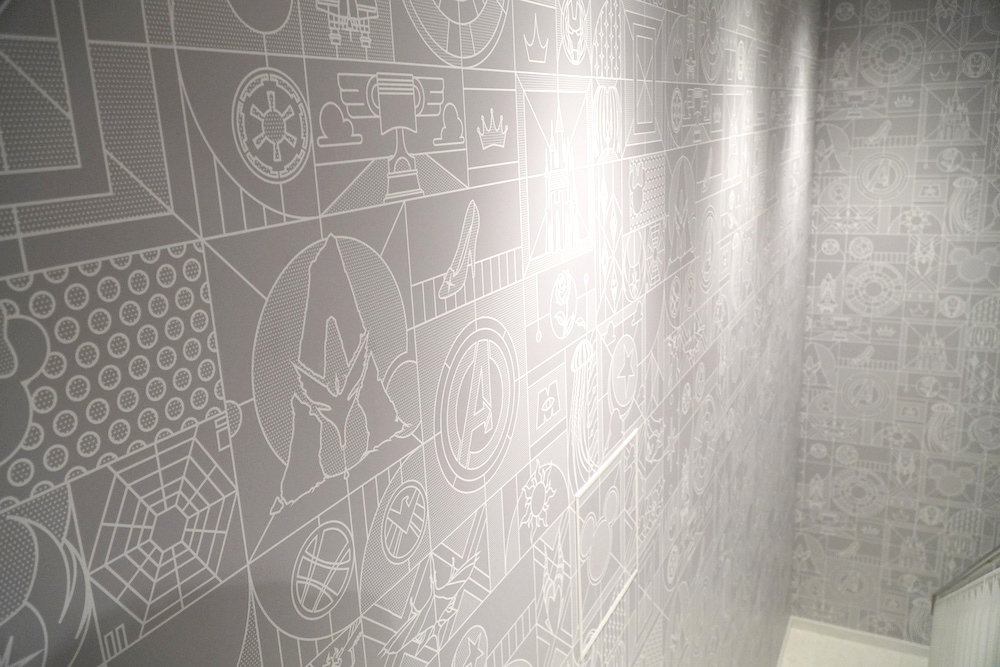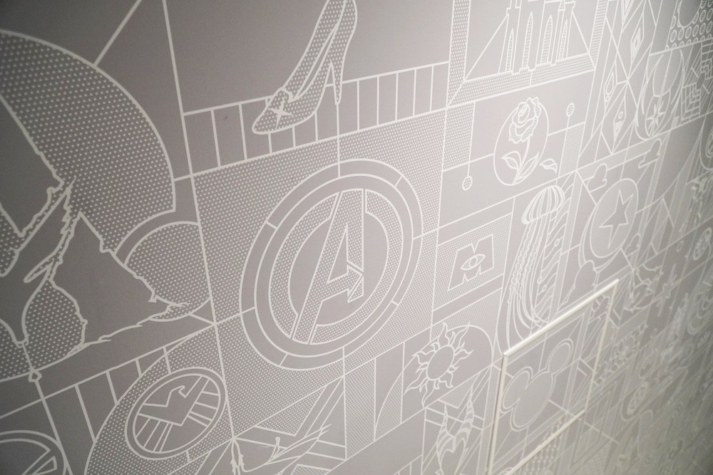 店舗内ではぜひ壁面にもご注目を。あれ、これって……と目をこらしてよーく見てみると、他にもたくさんのアイコンに気づくだろう。この壁面は本店舗のためにデザインした特別なパターン柄だそうで、ディズニー、ピクサー、スター・ウォーズ、マーベルからそれぞれの象徴的なアイコンを組み合わせてできている。これも、これも! と、壁を見ているだけで頭の中にそれらの作品の名シーンが呼び起こされ、これだけでもワクワクしてしまう。