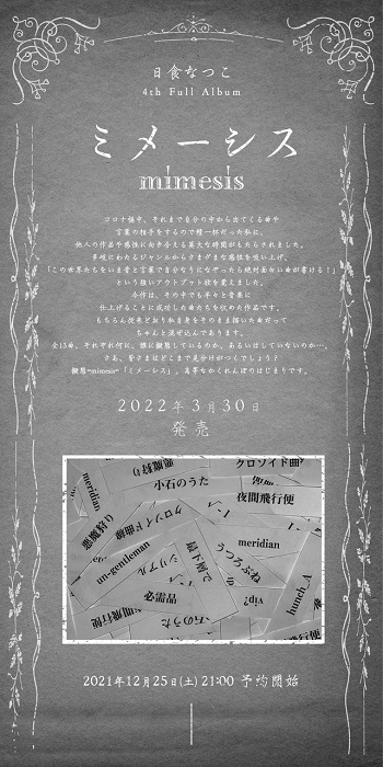 日食なつこが、2022年3月30日(水)に4th Full Album『ミメーシス』をリリースすることを発表した。
