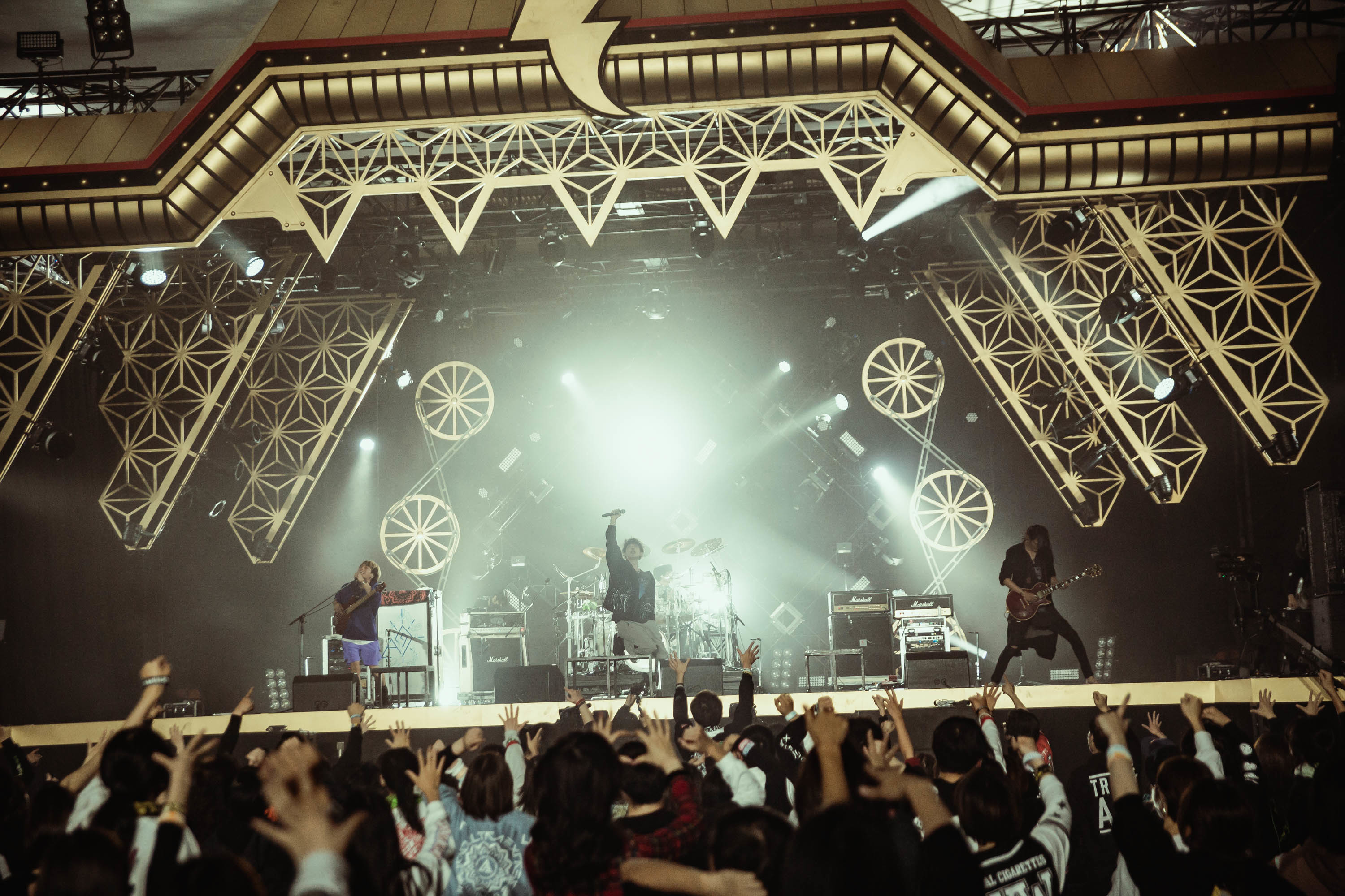 優しい先輩だというROTTENGRAFFTYに感謝の気持ちを告げ、その後に始めた「5150」ではステージ袖で観ていたNOBUYAが乱入してオーディエンスを歓喜させる。続く「MACHINEGUN」では鈴木重伸(G.)が超絶プレイを炸裂させ、ダイナミックなステージングで客席を前から後ろまで興奮させる。