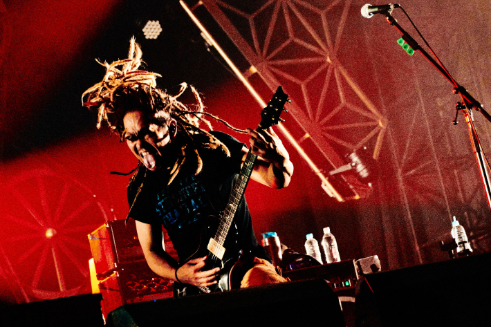 拳を頭上に掲げたダイスケはん(キャーキャーうるさい方)が「心で叫べー!!」と吠え、えぐい量のヘドバンを沸き起こした「握れっっっっっっっっ!!」でマキシマム ザ ホルモンのライブがスタート。いよいよトリ前、残る体力を振り絞ってオーディエンスも暴れまくる。