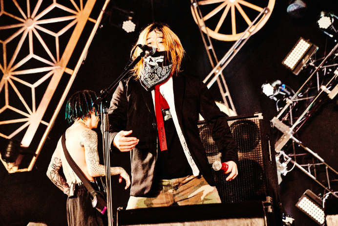 更にハンドマイクになったヤマサキが「まだまだ! 身振り手振りで着いてこいっ!」とオーディエンスにヘドバンを要求。最高のテンションのまま「KENKO不KENKO」でオーディエンスを存分にジャンプさせたかと思えば、立て続けに「囚」の重厚なグルーヴと鋭いリリックで攻め立てる。