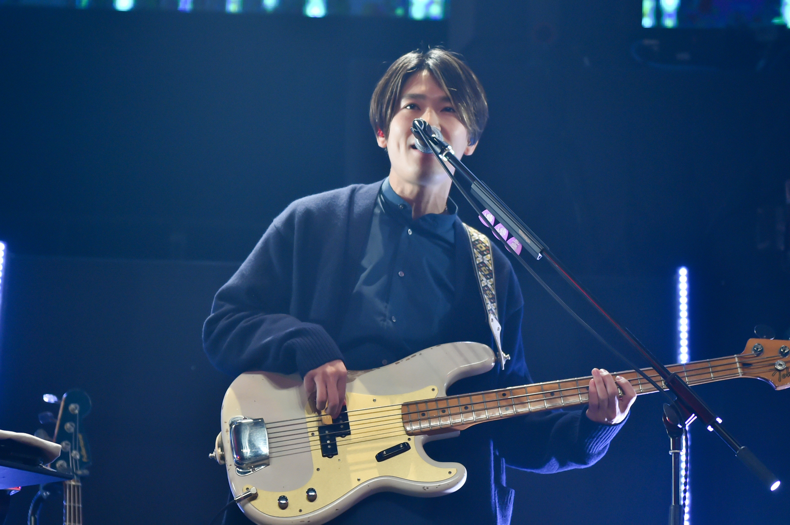 ゲーム実況の海老江邦敬が解説に加わり、岡本、HIROSHI、倉持、金デヴ(ストリーマー)が挑んだゲームは、最大60人で遊べるオンラインパーティーゲーム「Fall Guys: Ultimate Knockout」。障害物に立ち向かい、ライバルたちを押しのけ、上位数名しか勝ち残ることの出来ないゴールを目指すこのゲーム。アーティストチームが1ステージクリアするごとに観客にTシャツがプレゼントされるということで、会場中が熱い視線で見守る中、ゲームがスタート。「ライブより緊張します」と語っていたアーティストチームだったが、1stステージは4人とも見事クリア! だったのだが、急に難易度の上がった2ndステージで、岡本とHIROSHIが残念ながら敗退。白熱するプレイに観客も大きな盛り上がりを見せ、会場内に熱気が溢れるまま音楽ライブへとバトンを繋く。