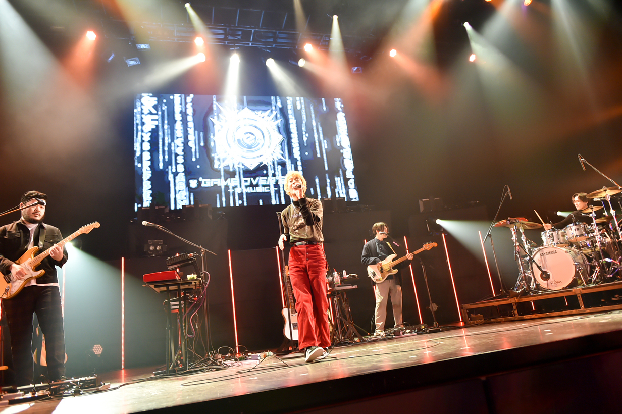 12月1日、東京・豊洲PITにて、“音楽ライブとeスポーツの異なる二つの文化のクロスオーバー”をテーマとした、全く新しいスタイルのライブイベント『GAME OVER FES -e MUSIC-』が開催された。音楽ライブパートとゲームパートが交互に行われ、ゲームパートでは出演アーティストが有名ストリーマーと本気のゲーム対決。その様子がTwitchの無料配信と有観客の両方で観覧出来るという、日本初となる画期的なスタイルで行われたこのイベント。開演前にはTwitchで、この日の出演者である岡本信明(the telephones)、HIROSHI(FIVE NEW OLD)に加え、MAH(SiM)、櫻井真(Dragon Ash)、Masato(Coldrain)にStylishNoob(ストリーマー)も参加した「Apex Legends」の事前配信番組も行われ、開演前からオンラインで大きな注目と盛り上がりを見せる中、豊洲PITでの有観客でのライブがスタートした。