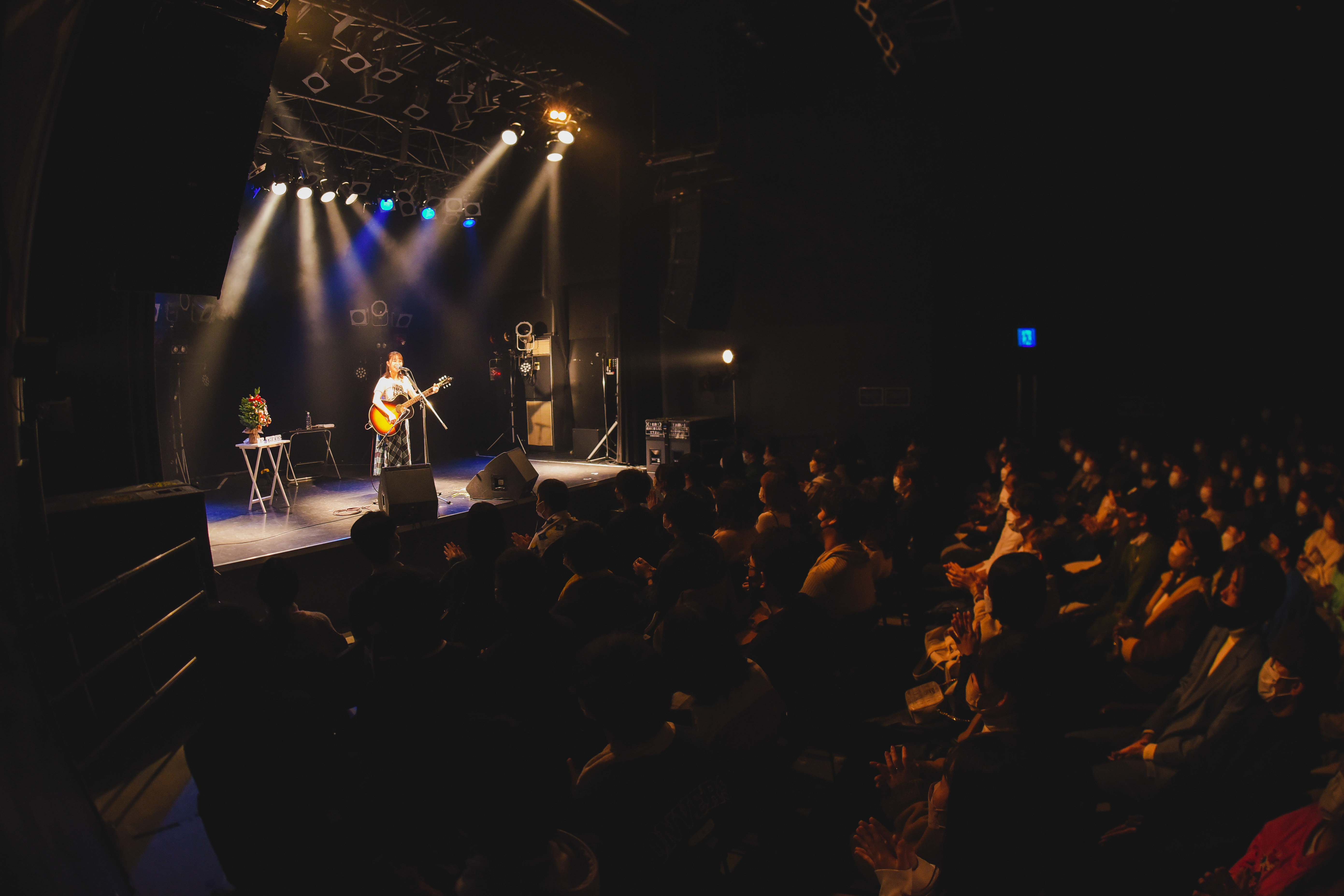 すっかり温まった会場へ、軽く手を挙げスタートの合図を送る坂口有望がオンステージ。いきなりの新曲「歌を歌わなければ」では、ソリッドな言葉で彼女のピュアネスな感受性を浮き彫りにさせていく。アコギの音色も強靭で、メロディ一つ一つから彼女の怒り、悲しみ……そして希望の色が見て取れ、冒頭から容赦なく鮮やかな存在感を見せつけていく。小柄な彼女はその印象を華麗に覆し、ステージに立つや何と大きなメッセージを放つのだろう。万雷の拍手を浴び、続いての「おはなし」でもロングトーンで魅せ、より客席のエモーションを高めていく。