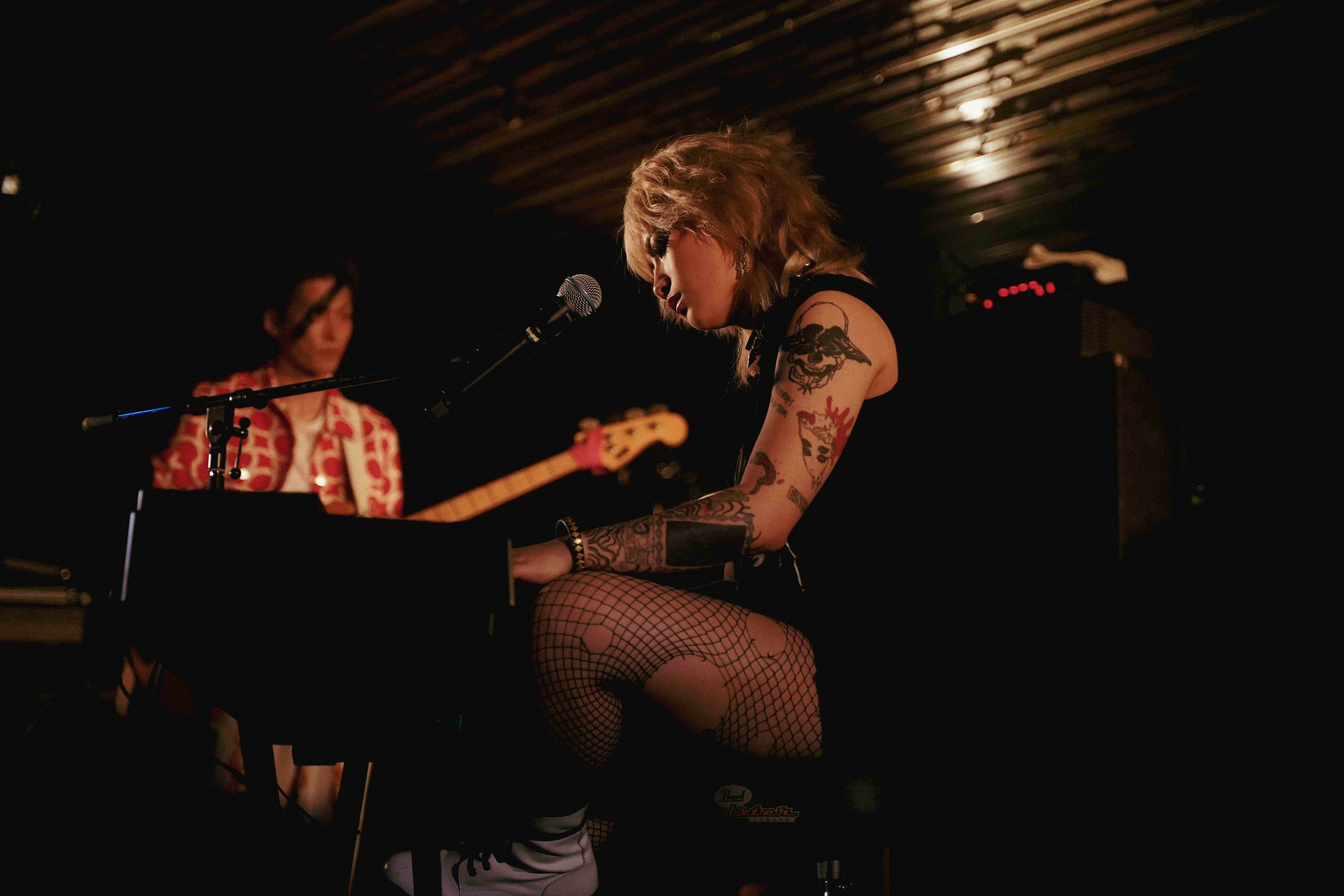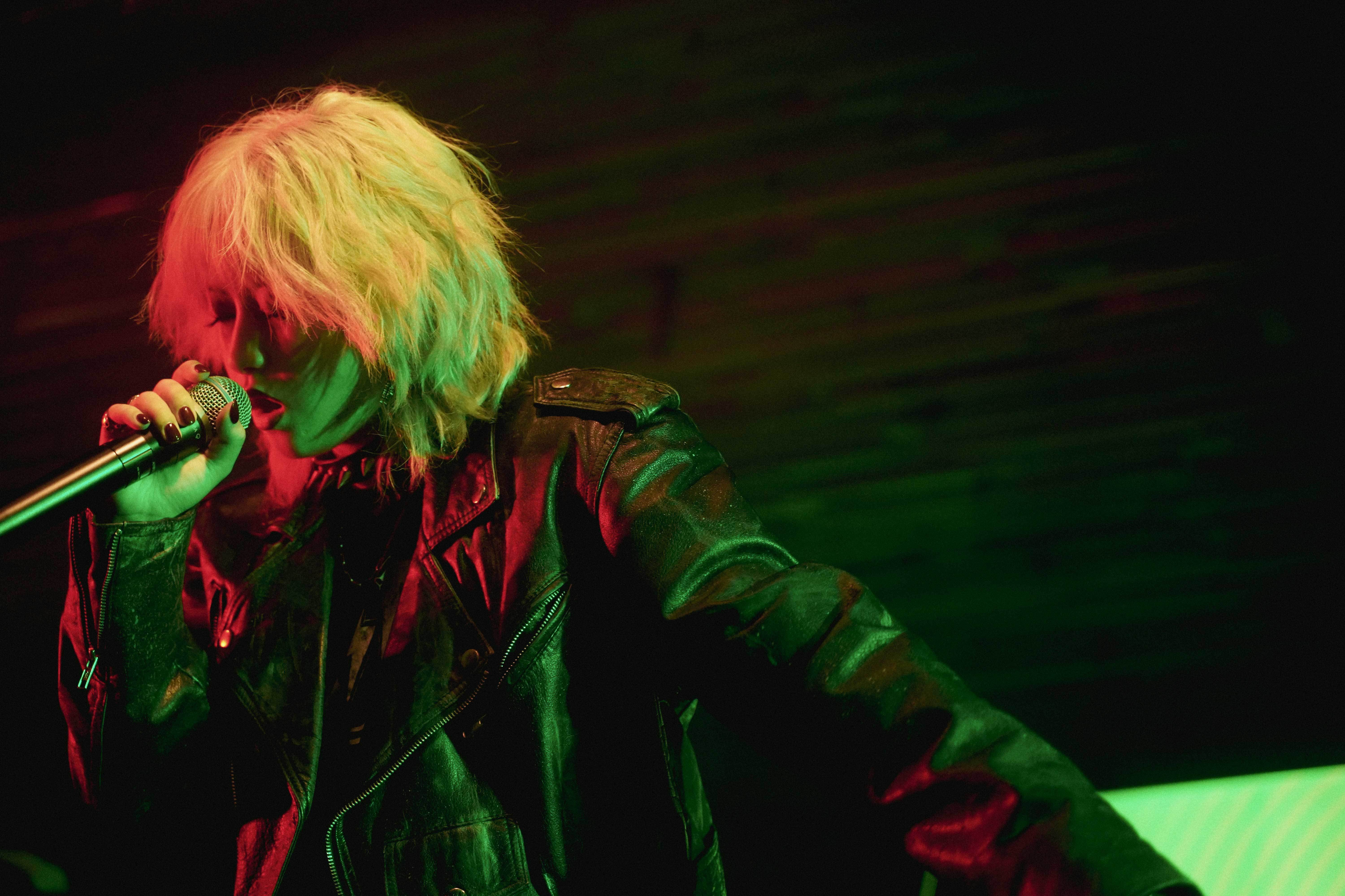 続いては福岡出身で18歳のDoul。完全自己プロデュースアーティストで、Spotifyが2021年に躍進を期待する次世代アーティストを決める『RADAR:Early Noise 2021』に抜擢、Nike Japanとアンバサダー契約を結ぶなど、音楽のみならずファッション分野でも注目を浴びている。この日はDoulの記念すべき大阪初ライブ。ドラムのカウントでステージがパッと明るくなり、目に飛び込んできたDoulの出で立ちに驚いた。ライオンみたいな金髪、バチバチのメイク、革ジャン、ショートパンツに穴あき網タイツ。バンドメンバーもデヴィッド・ボウイや80年代ハードロックバンドを彷彿とさせるファッションとメイクに身を包んでいる。