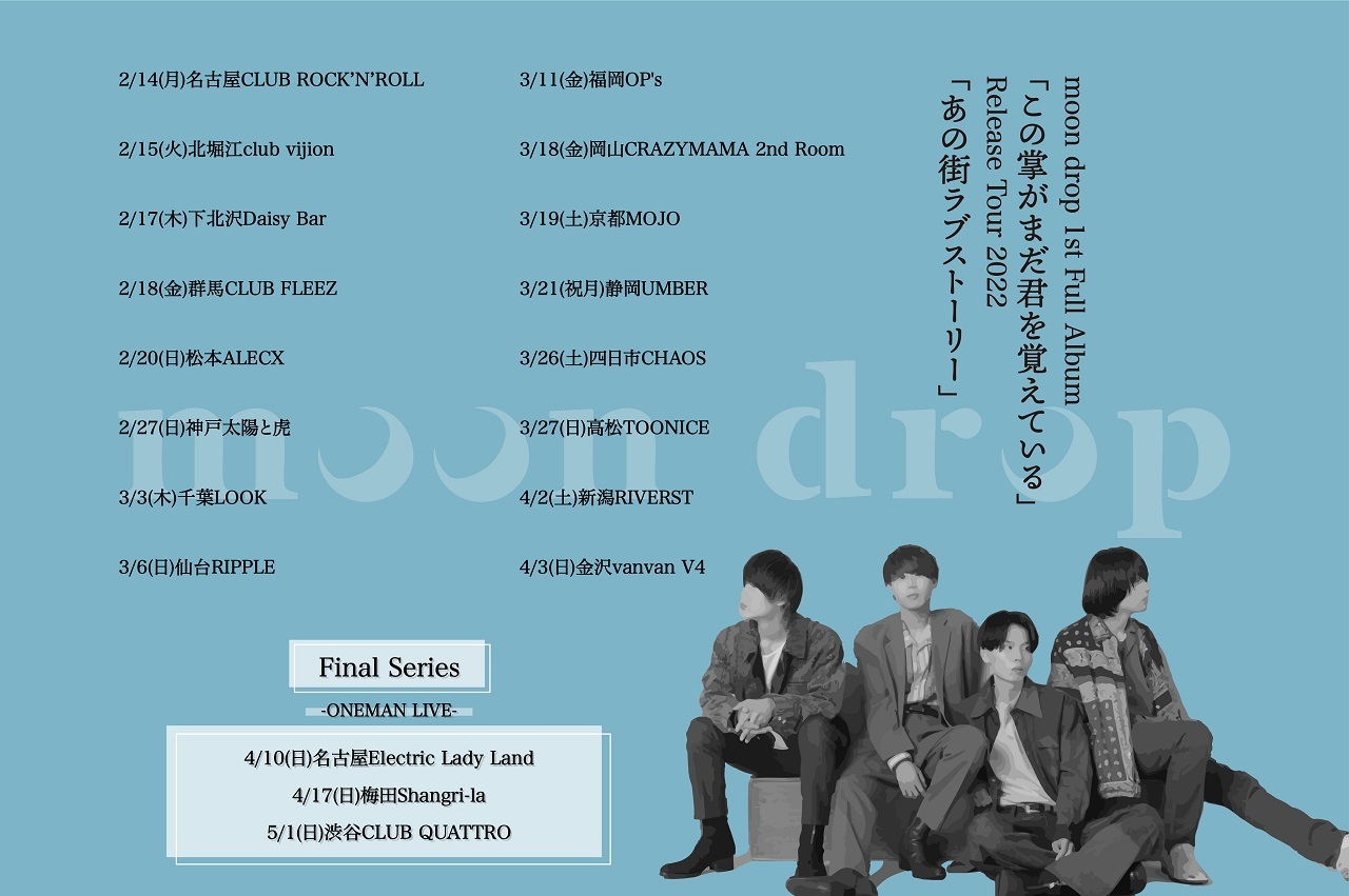 2022年1月19日に1st Full Album『この掌がまだ君を覚えている』をリリース。翌月からは全国ツアーの開催が発表されていたが、そのファイナルシリーズとして、バンド初のワンマンツアーを開催する。東名阪の3公演が予定されており、ツアーファイナルは5月1日(日)渋谷CLUB QUATTROにて行われる。moon drop史上最大キャパでの公演かつ、初のワンマンライブとなる。