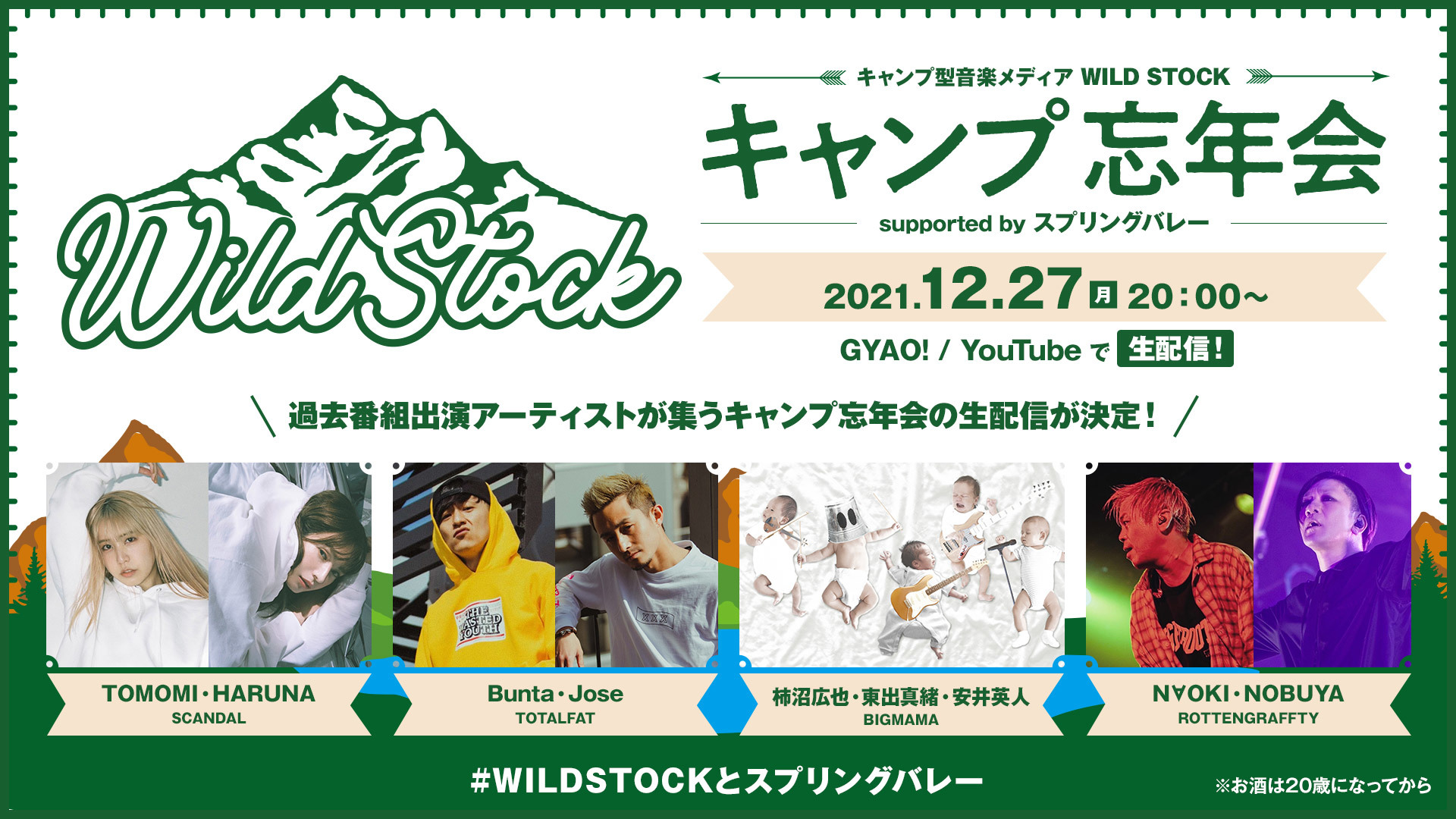 動画配信サービス「GYAO!」とイープラスSPICEが運営する『WILD STOCK』公式YouTubeチャンネルにて、キャンプ型音楽メディア『WILD STOCK』の特別版『WILD STOCKキャンプ忘年会 supported by スプリングバレー』を12月27日(月)20時より無料生配信することが決定した。