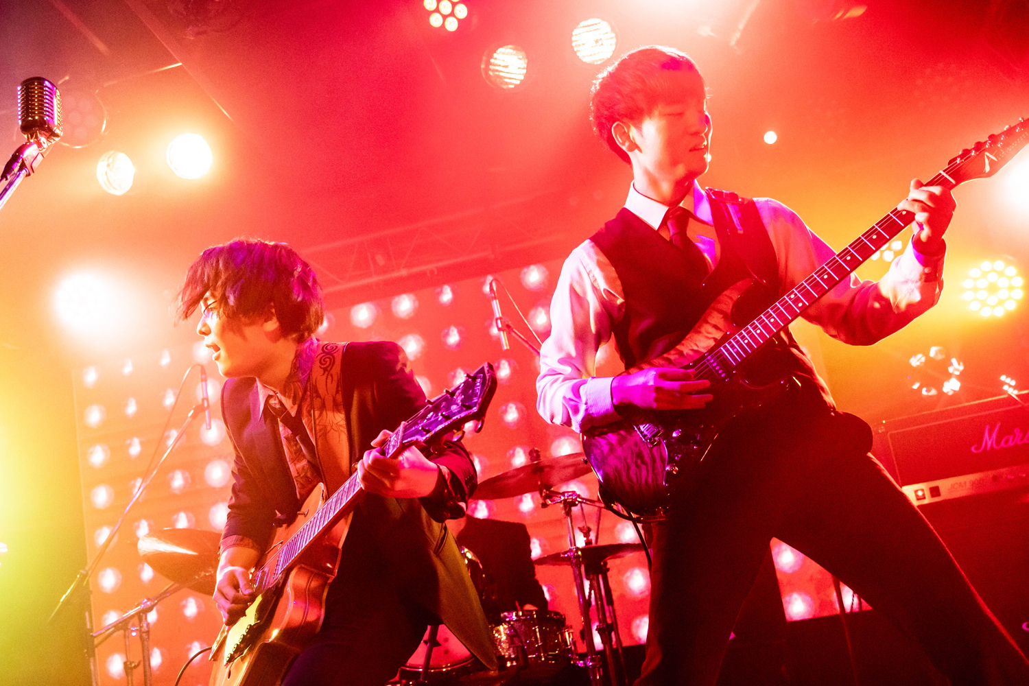 若手ながらロックンロール・バンドとしての矜持やそれを裏付けるバックボーンが見えるバンドスタイルや魅せ方、サウンドは、好感と興味が湧くばかり。ミラーボールの光がよく似合う痛快なロックンロールを聴かせた「Music presents」、TAKUMIの胸に迫る歌声が印象的だった「Radio blues」と続き、MCでは新メンバーとして加入したベースのKensupuを紹介。この日が新メンバー加入後初、かつ年内最後という大事なライブであることを告げると、「新曲を持ってきましたので、演っちゃいます」と、ブルージーな新曲「SMOKER」を披露。
