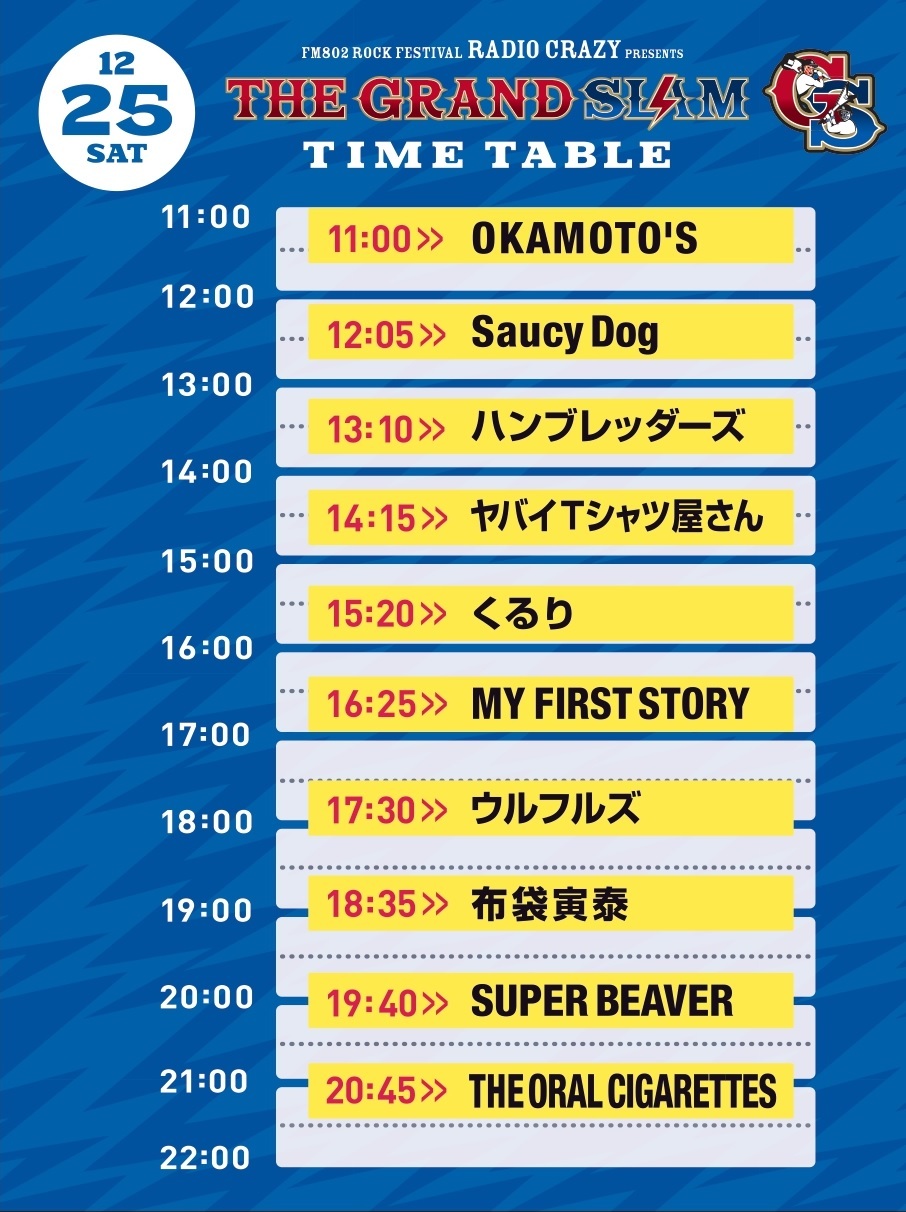 樋口大喜:特に開幕戦となる初日でいえば、くるり、ウルフルズ、布袋寅泰さんがいて、我々世代のSaucy DogにTHE ORAL CIGARETTES、SUPER BEAVER、ハンブレッダーズ、ヤバイTシャツ屋さんがいる。このメンツが1日の同じステージで観れることが、FM802のカラーなんやろなと思いますね。しかも、『RADIO CRAZY』皆勤賞のOKAMOTO'Sがトップバッターでね。これまでのイベントの歴史も感じられるようなタイムテーブルになっているようにも感じます。