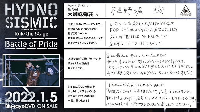 2021年8月14日(土)・8月15日(日)に大阪・丸善インテックアリーナ大阪、8月24日(火)・25日(水)に横浜・ぴあアリーナMMにて公演が実施された、ヒプノシスマイク舞台化作品「ヒプステ」の初のライブ公演となる〝『ヒプノシスマイク -Division Rap Battle-』Rule the Stage -Battle of Pride-〟 。2022年1月5日(水)発売の本公演の模様を収めたBlu-ray & DVD発売を目前に控え、出演キャストからの手書きコメント画像と、パフォーマンス映像の一部がヒプステ公式Twitterにて公開された。