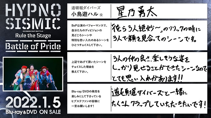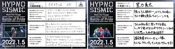 手書きコメントは-Battle of Pride-公演に出演した10名のキャストから寄せられており、今後12月27日(月)、12月30日(木)、1月3日(月)、1月5日(水)に公開が予定されているので、年末年始もヒプステ気分を堪能し、1月5日(水)のBD・DVD発売を楽しみに待ちたい。
