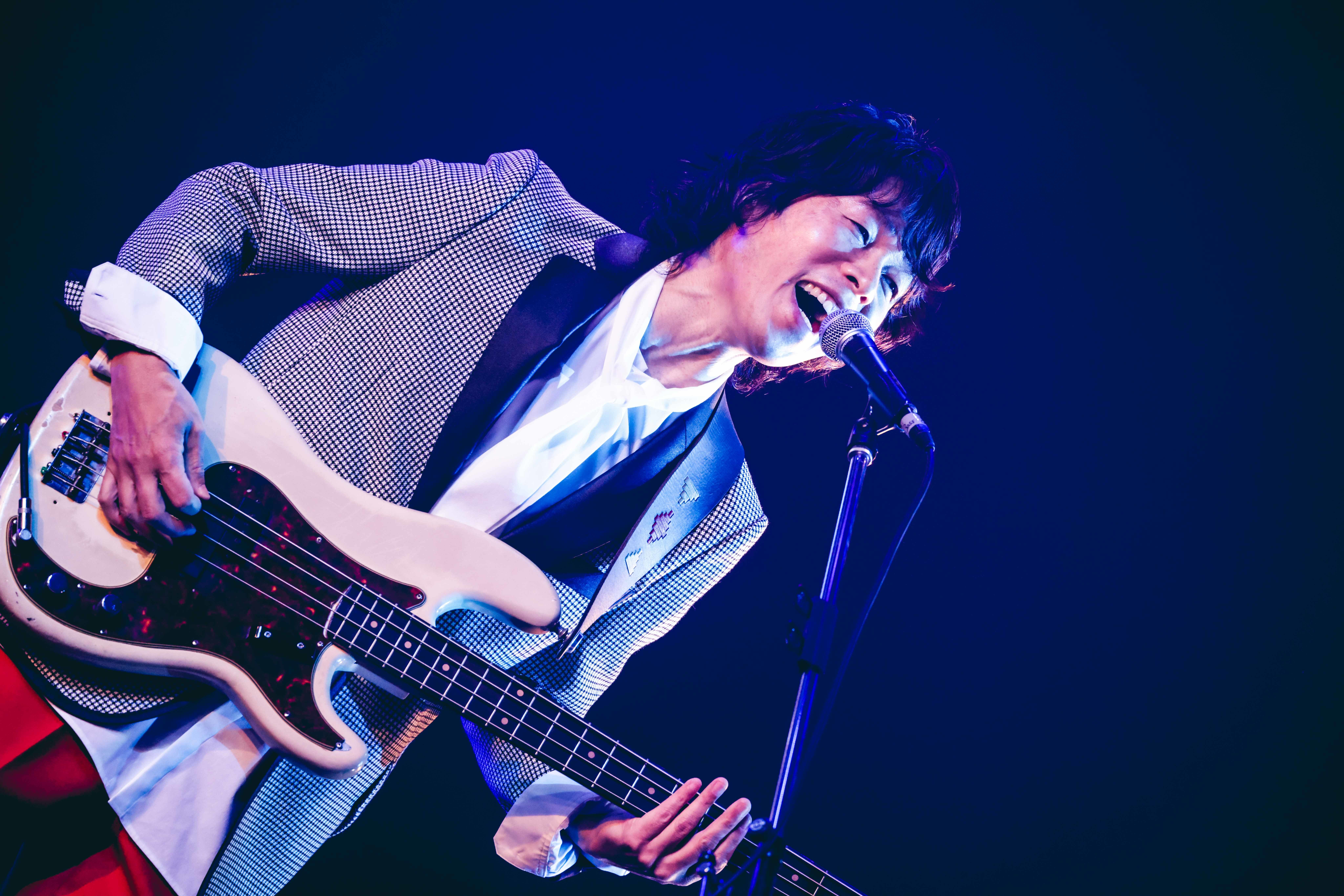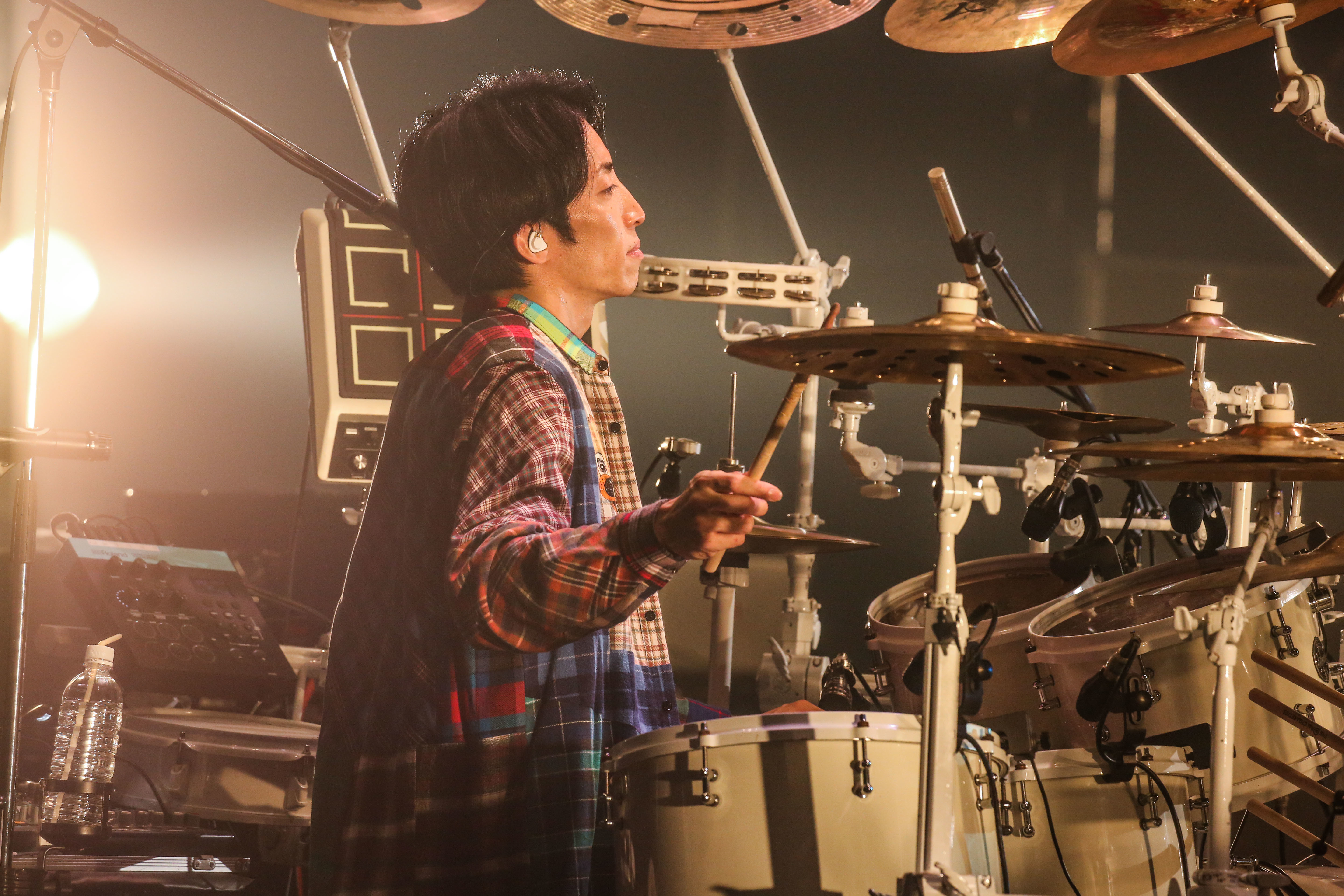 MCでは大阪近鉄バファローズのファンだったという山中が、今宵はイベント特製ユニフォームで登場するも、リクエスト多数により自ら持参したサンタクロース柄の愉快なカーディガンを羽織る羽目に。「この衣装で真ん中に立ってるの、すごく恥ずかしいので盛り上がってくださいね?」なんておどけつつ、「Dream In Drive」へとなだれ込む! 「もっといけるんちゃう?」なんて、会場の壮絶なほどの連帯にもまだまだとばかりに煽り続け、「MACHINEGUN」では中西雅哉(Dr)の変則的ながら正確無比なドラミングで体の芯から容赦なく揺さぶっていく。