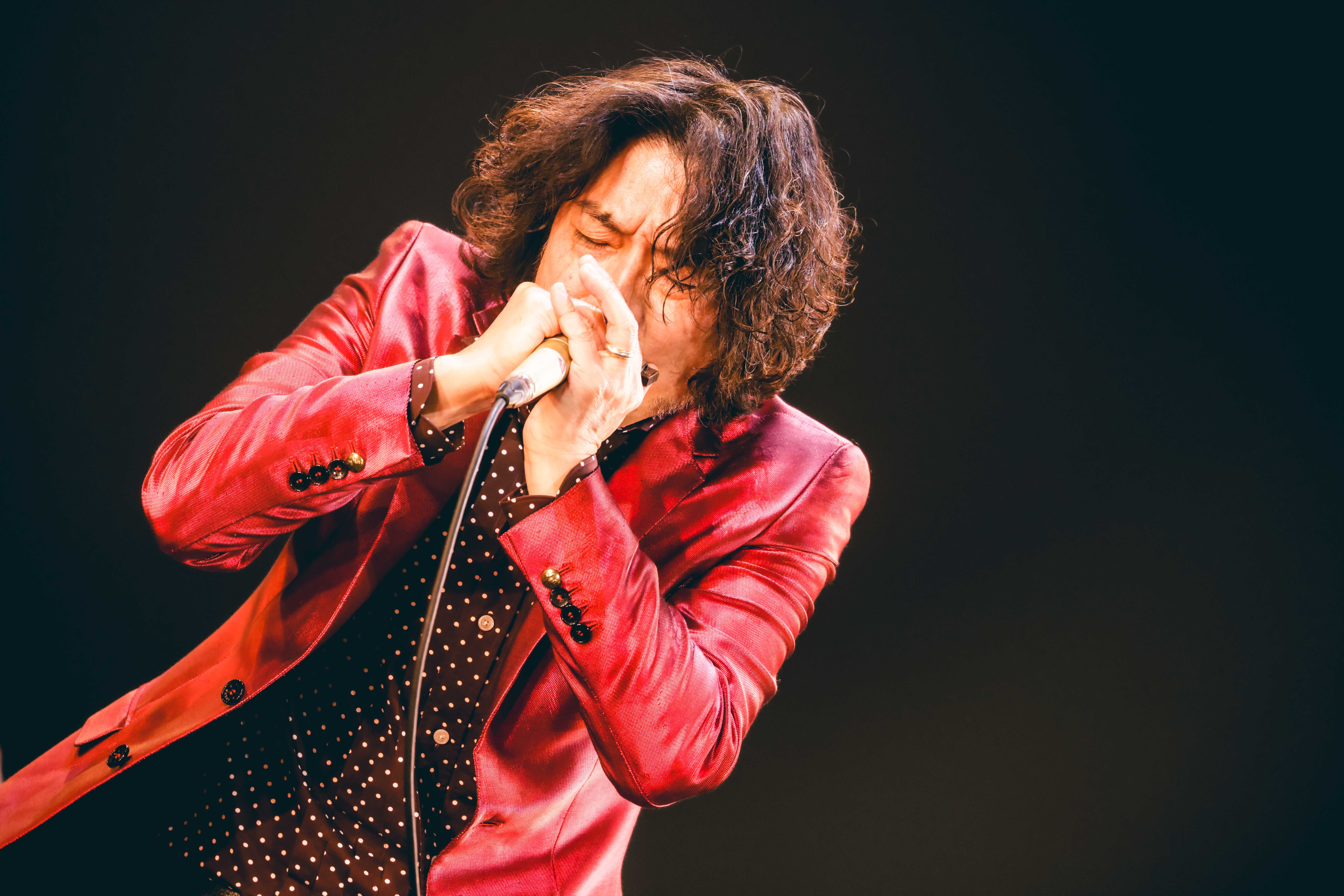 ジャケットを脱ぎ捨て、HOTEI柄モデルのギターに持ち替えた彼は、イントロから凄まじい求心力の「スリル」をブチ上げる! 轟音プレイからサビでの甘くセンチメンタルなフレーズが否応なくテンションの天井を突き破り続け、終盤には歌詞を<おまえ「たち」のものさ>と歌い変えれば、観客の歓喜の表情がマスク越しですら分かるほどだ。「POISON」のメロディアスで美麗なソロパートにも釘付けにさせられ、再びこの日への心情を紡ぐ彼。